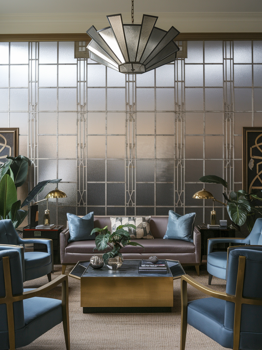 Lighting plays a major role in defining the mood of an Art Deco living room. Choose a chandelier, globe pendant, or sculptural floor lamp with geometric shapes and metallic finishes. Layered lighting helps create a warm and inviting atmosphere while highlighting key design features. Frosted glass, brass arms, and symmetrical designs reflect the classic style while remaining functional for modern living.