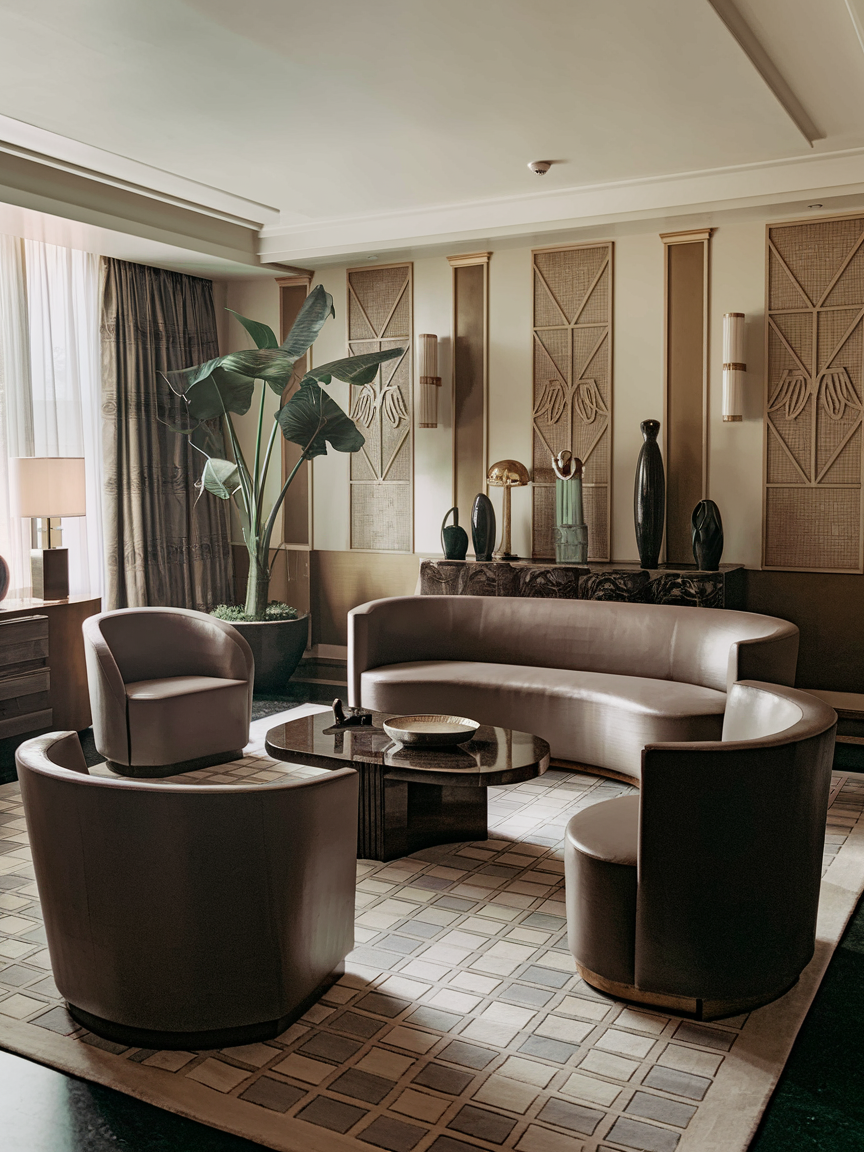 Soft curves balance the bold geometry of Art Deco design. Incorporate rounded armchairs, arched sofas, or circular ottomans to create visual contrast and comfort. Curved furniture adds elegance and helps soften the overall look, preventing the room from feeling too rigid. Pair these pieces with structured décor elements to maintain harmony between softness and structure.