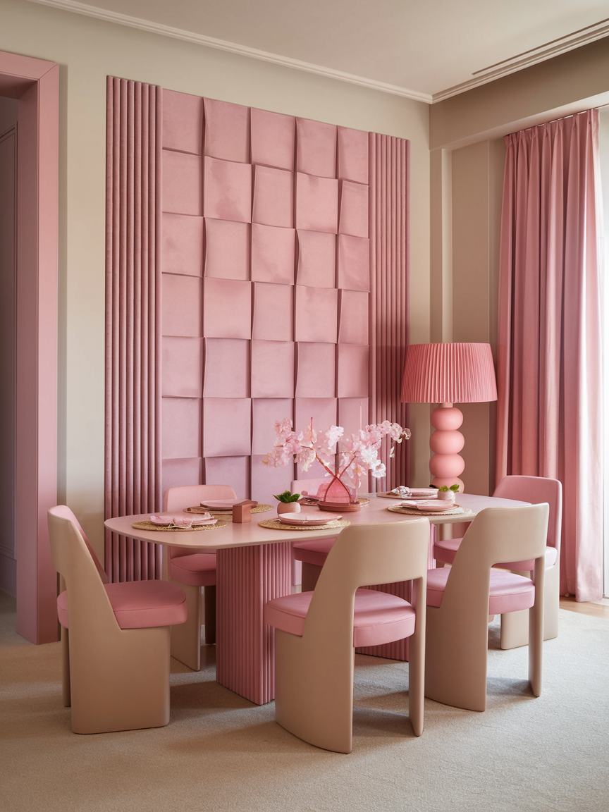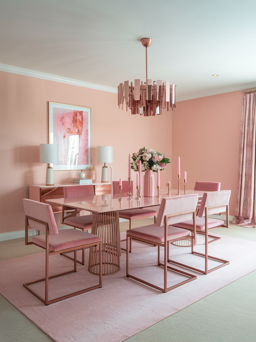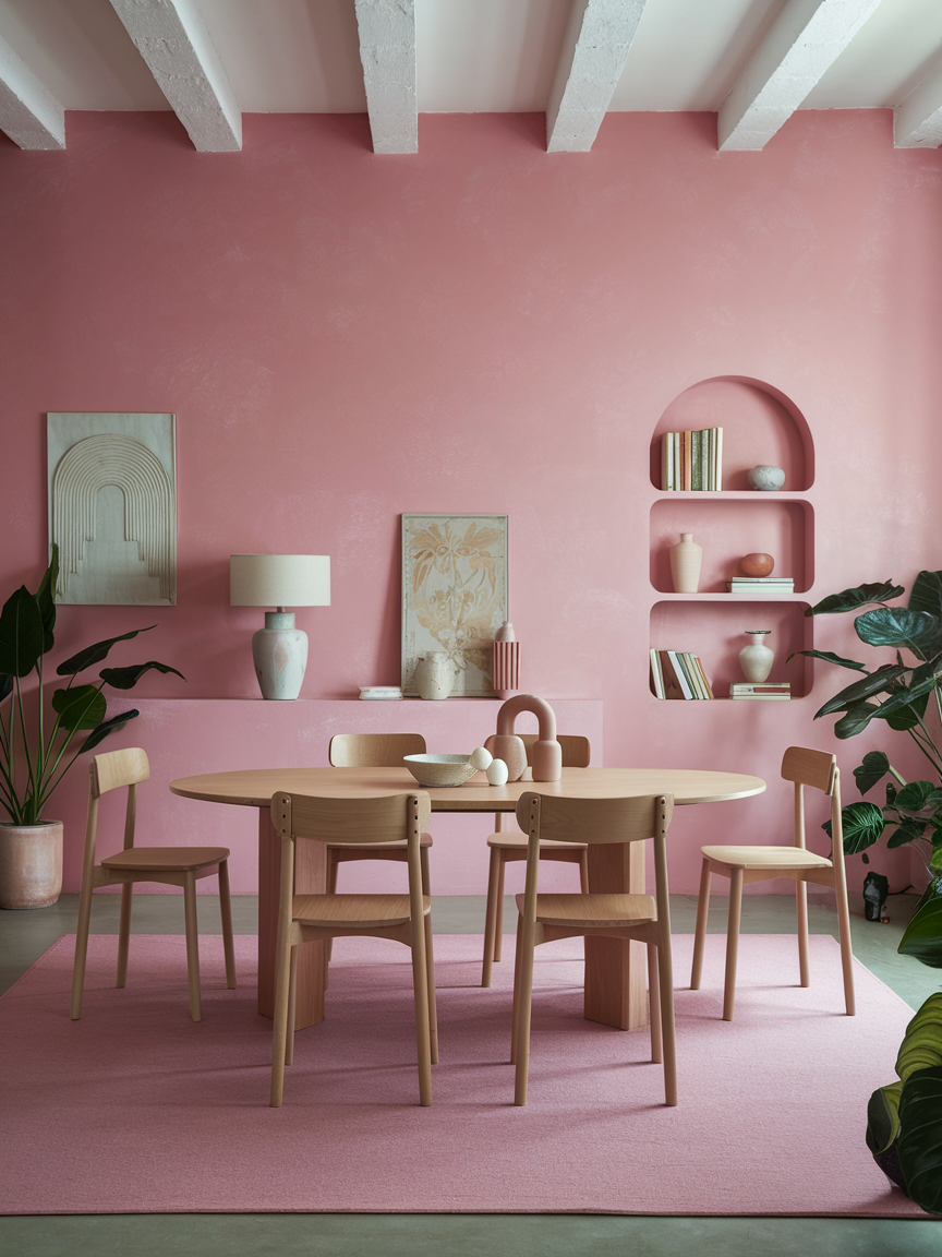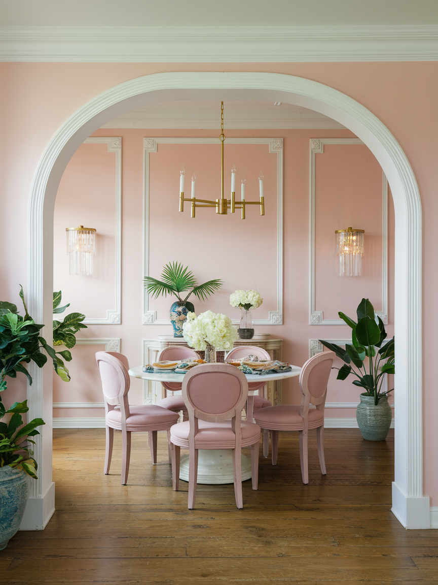 A gentle blush backdrop instantly creates a calming and airy dining space that feels both elegant and approachable. When paired with crisp white furniture, such as a sleek dining table or classic chairs, the room takes on a light, refreshing quality that reflects natural light beautifully. This combination works especially well in smaller spaces, as it visually expands the room while maintaining warmth. Adding subtle gold, ceramic, or glass decor elements introduces just enough sophistication without overwhelming the soft palette, resulting in a serene yet cheerful atmosphere perfect for everyday dining.