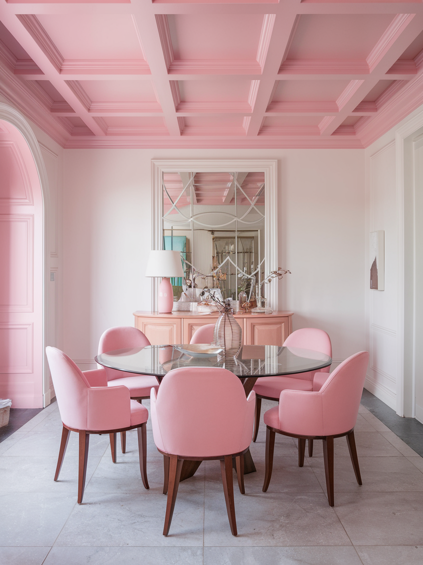 A pink ceiling offers a unique and unexpected way to introduce color into your dining room without overwhelming the walls. This design choice draws the eye upward, creating a sense of height and openness while casting a soft, warm glow over the entire space. It pairs beautifully with neutral walls and simple furniture, allowing the ceiling to become a subtle yet impactful feature. This approach is perfect for those who want something creative and distinctive.