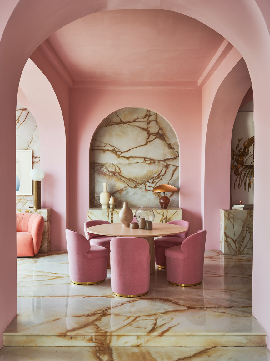 Blush pink tones paired with marble surfaces create a refined and luxurious dining space that feels timeless and sophisticated. The natural veining in marble adds texture and movement, while the soft pink enhances the overall warmth of the room. This combination works well in both modern and classic interiors, offering a versatile aesthetic that feels elevated yet inviting. Incorporating metallic accents can further enhance the elegance of this design.