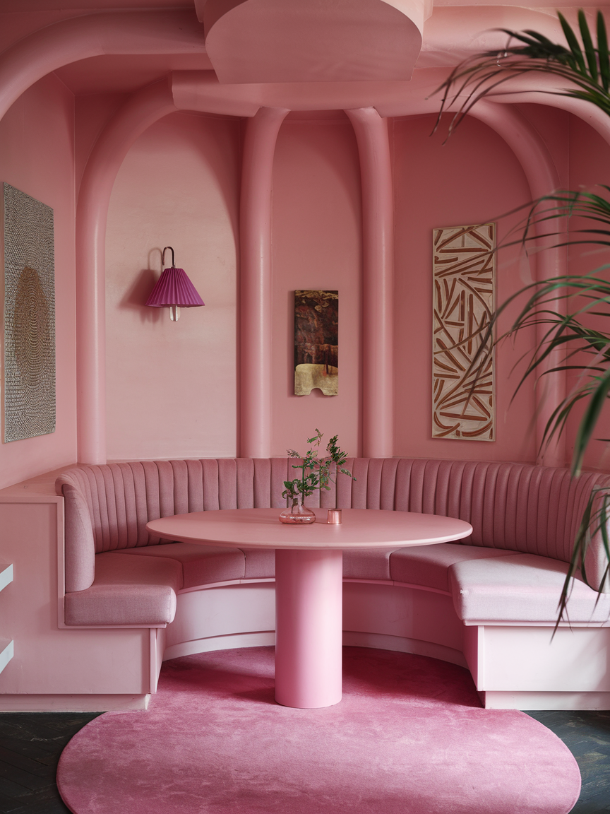 Pink upholstered built-in seating creates a cozy and functional dining nook that maximizes space while adding a custom feel to the room. This design is perfect for smaller dining areas or open-plan layouts, where efficiency and comfort are key. The soft pink upholstery adds warmth and charm, making the space feel inviting and intimate. Pair it with a simple table and soft lighting to create a relaxed yet stylish dining experience.