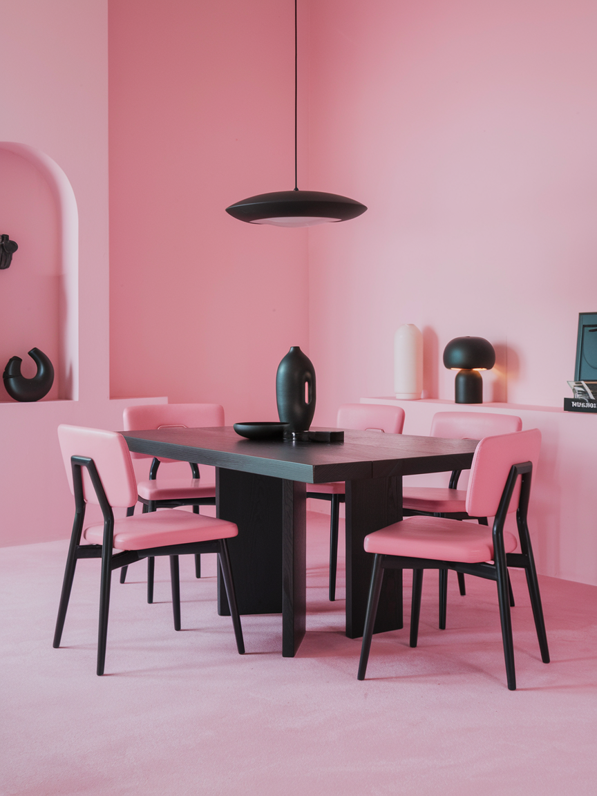 Pairing pink with black introduces a bold, contemporary edge that transforms a soft color into something striking and modern. Black elements, such as dining chairs, light fixtures, or table frames, anchor the space and provide contrast, allowing the pink tones to stand out more vividly. This combination works especially well in minimalist or urban interiors where clean lines and strong contrasts define the aesthetic. The result is a dining room that feels confident, stylish, and full of personality without losing its inviting warmth.