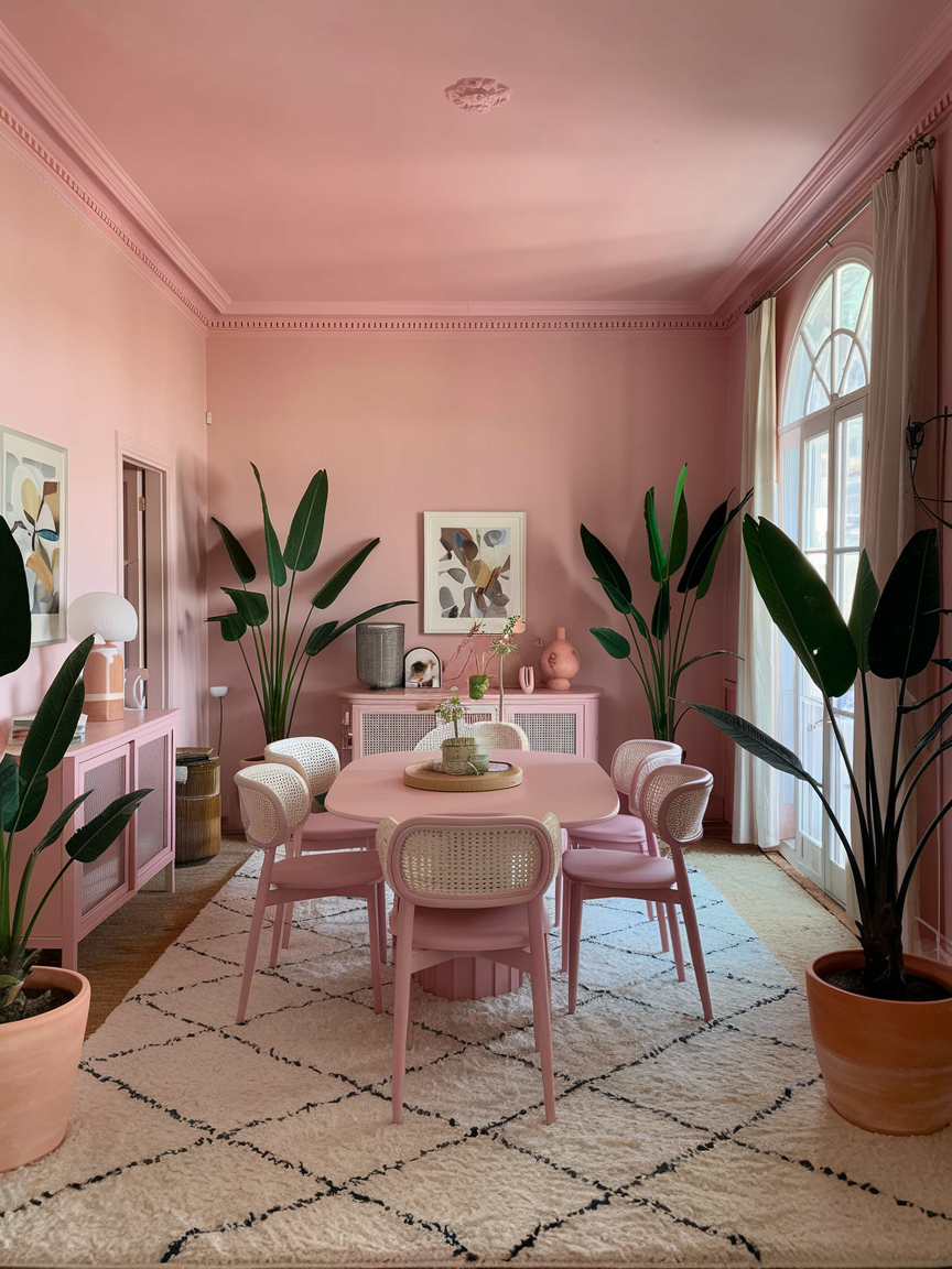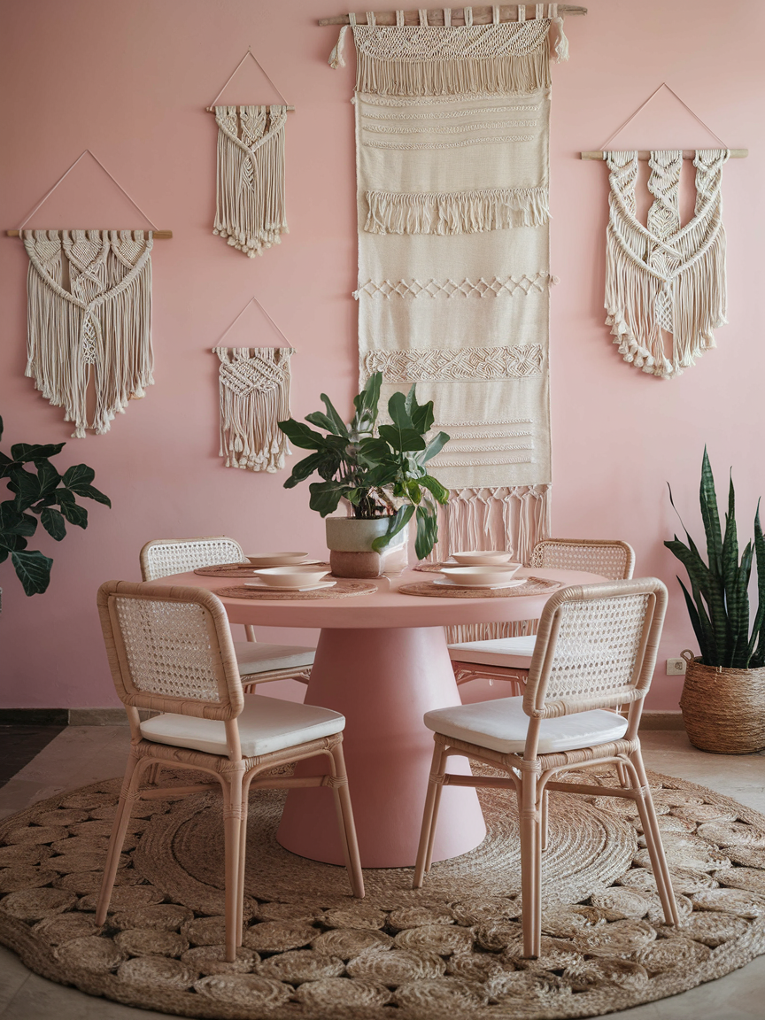 A pink boho dining room combines relaxed textures, eclectic decor, and soft hues to create a space full of personality and warmth. Incorporate elements like rattan chairs, woven rugs, macramé wall hangings, and layered textiles in varying pink tones. This approach embraces imperfection and creativity, resulting in a dining area that feels lived-in and inviting. The soft pink palette ties everything together while allowing different materials and patterns to shine.