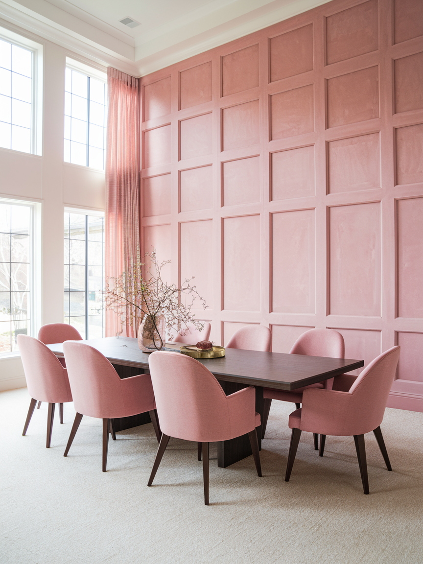 Pink wall paneling adds architectural interest and depth to your dining room while maintaining a soft and elegant color palette. The structured lines of paneling create subtle shadows and dimension, preventing the pink from feeling too flat or simple. This design works beautifully in both classic and modern interiors, depending on the panel style you choose. It’s a sophisticated way to incorporate color while elevating the overall design of the space.