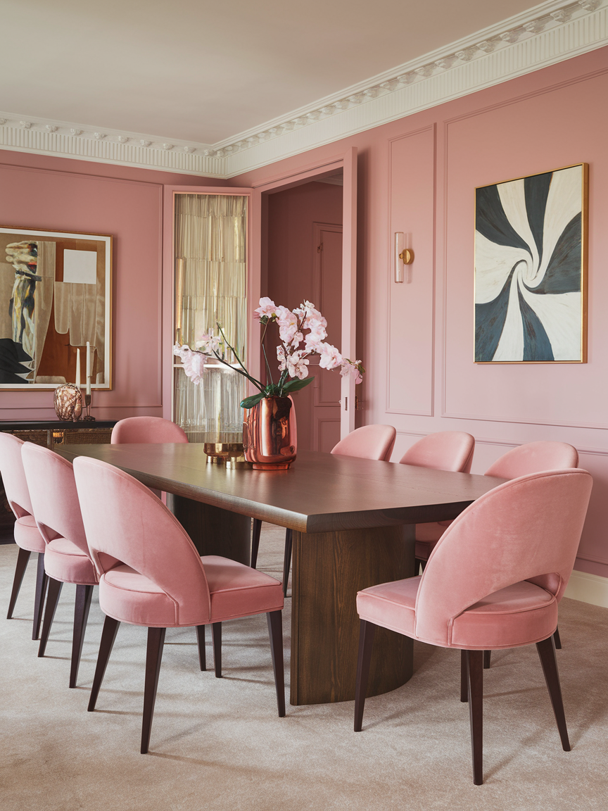 Dusty rose tones paired with natural wood elements create a beautifully balanced dining space that feels grounded, warm, and effortlessly stylish. The earthy quality of wood, whether in a dining table, flooring, or exposed beams, adds a natural contrast that prevents the pink from feeling overly sweet. This pairing works particularly well in modern rustic or Scandinavian-inspired interiors, where simplicity and texture take center stage. The result is a cozy, welcoming atmosphere that feels timeless while still embracing a soft, contemporary color palette.