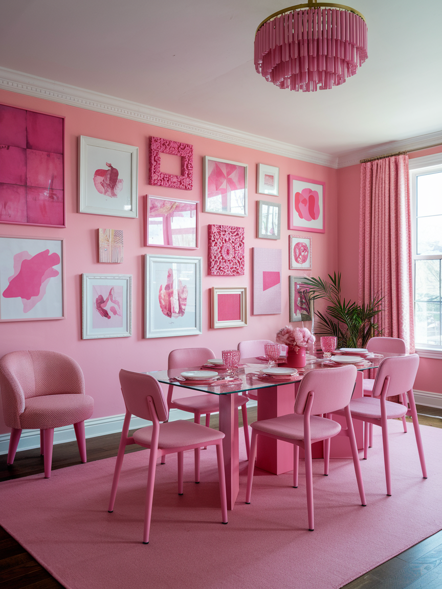 A gallery wall featuring pink-themed artwork is a creative way to infuse color and personality into your dining room. By mixing different art styles, frames, and shades of pink, you can create a visually engaging focal point that reflects your personal taste. This approach allows flexibility, as you can easily update or rearrange the artwork over time. It’s a stylish and expressive way to tie the entire room together.