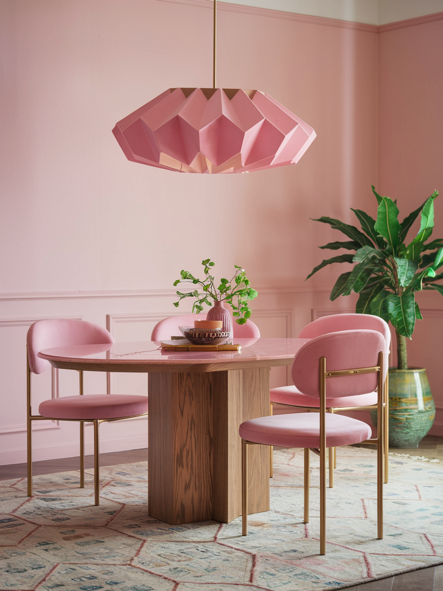 A pink statement light fixture, such as a chandelier or pendant, can become the centerpiece of your dining room, drawing attention and adding a playful yet elegant touch. Whether the fixture is subtly tinted or boldly colored, it enhances the overall design while providing functional illumination. This approach allows you to incorporate pink in a unique and eye-catching way without committing to larger elements like walls or furniture.