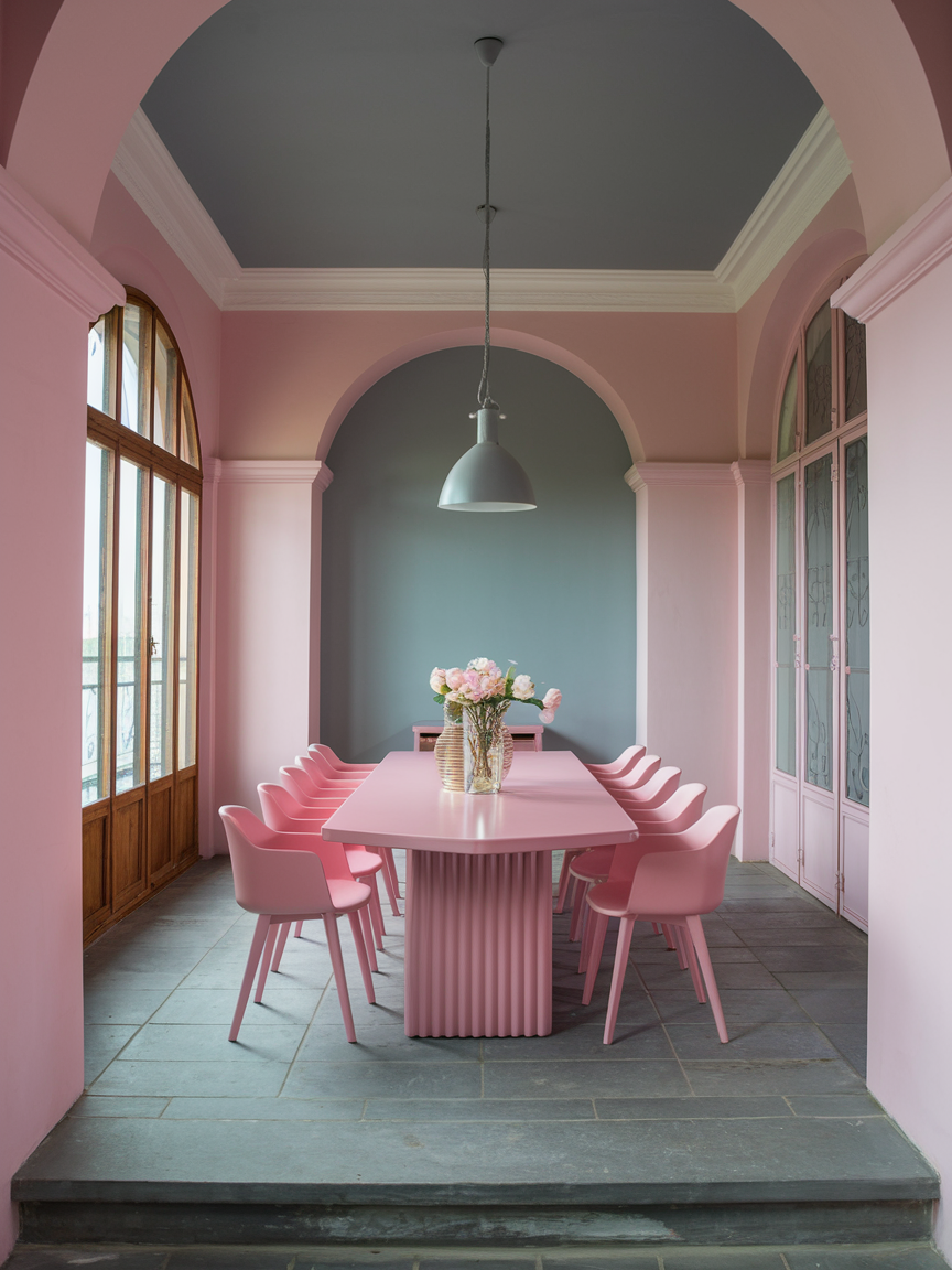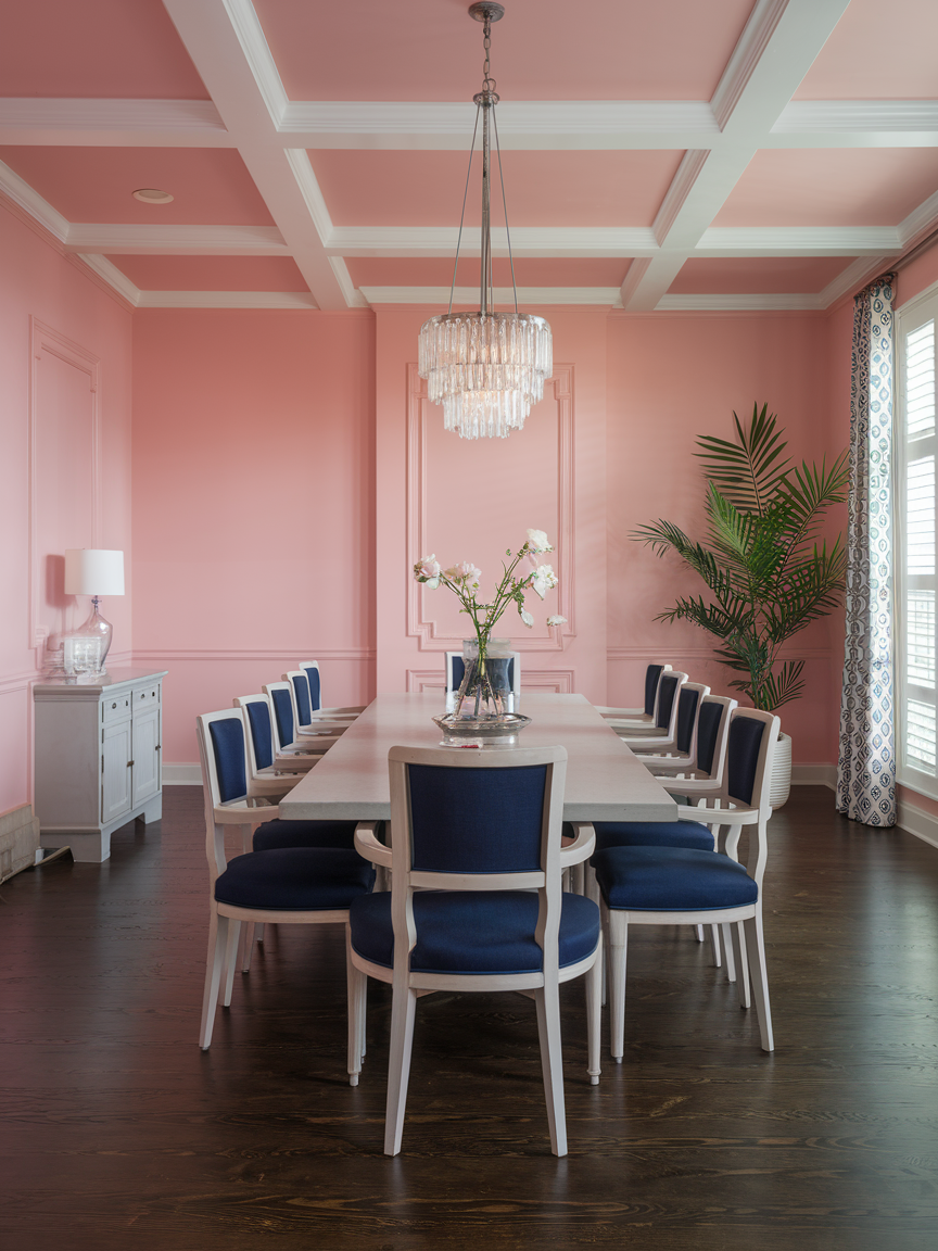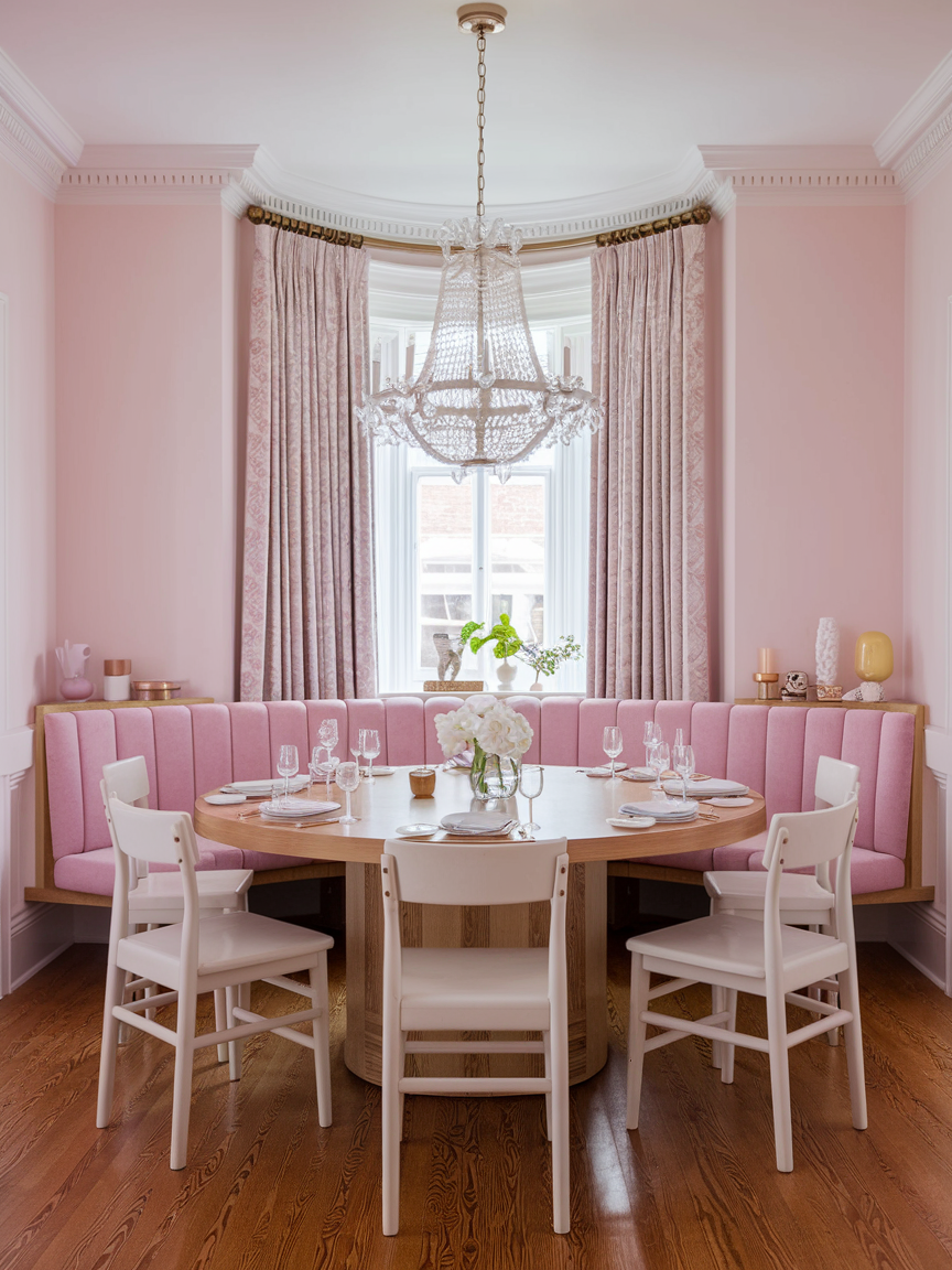 The timeless pairing of pink and white creates a dining room that feels fresh, bright, and effortlessly elegant. White keeps the space feeling open and clean, while pink adds warmth and personality. This combination works in a variety of styles, from traditional to modern, making it a versatile and reliable choice.