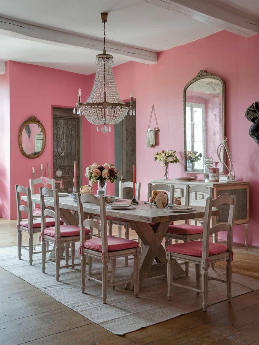 Combining pink tones with rustic elements like distressed wood, vintage decor, and natural textures creates a cozy and inviting dining room with character. The softness of pink balances the ruggedness of rustic materials, resulting in a space that feels warm and welcoming. This style is perfect for those who appreciate a blend of charm, comfort, and subtle elegance.