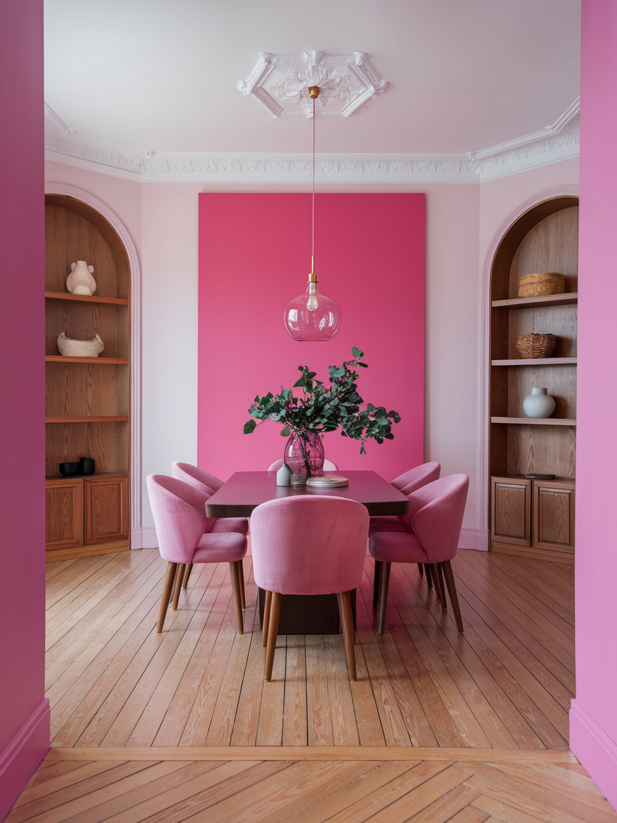 A fuchsia accent wall is the perfect way to inject energy and personality into your dining space. This vibrant shade creates a bold focal point that instantly draws attention and sets a lively tone for the room. To keep the design balanced, pair the wall with neutral furniture and minimal decor, allowing the color to shine without overwhelming the space. This approach is ideal for those who want a dining room that feels dynamic, modern, and full of character, making it perfect for entertaining guests.