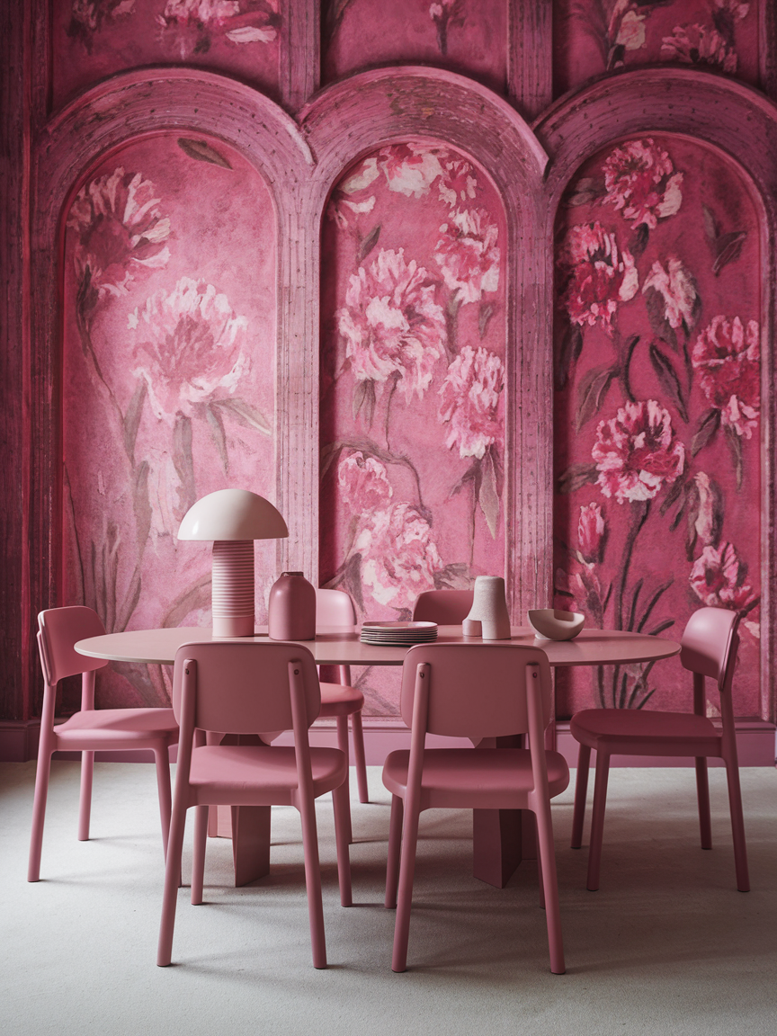 Pink floral wallpaper introduces a sense of charm and storytelling to your dining room, transforming it into a space that feels both romantic and lively. The intricate patterns add visual interest and depth, while the pink tones keep the look cohesive and warm. Pairing the wallpaper with simple, neutral furniture ensures the design remains balanced and not overly busy. Adding fresh greenery or floral arrangements further enhances the natural feel, creating a dining environment that feels vibrant, welcoming, and full of personality.
