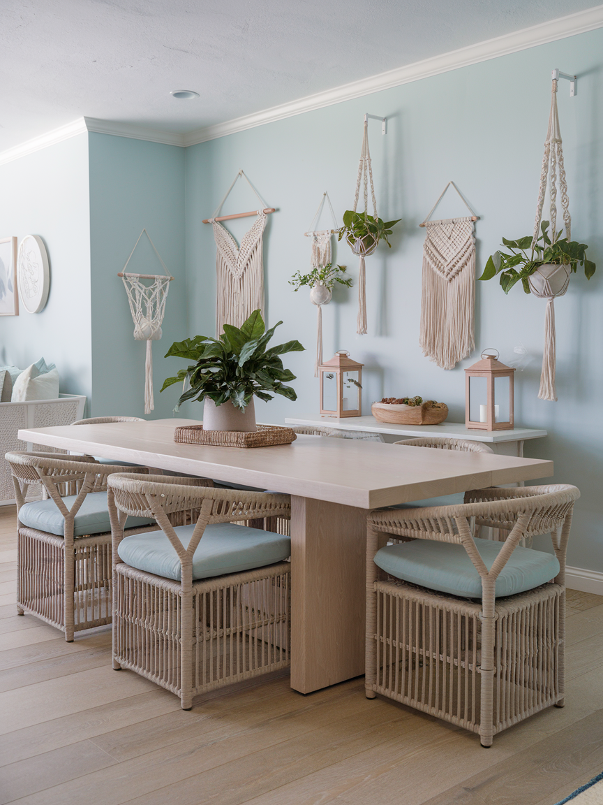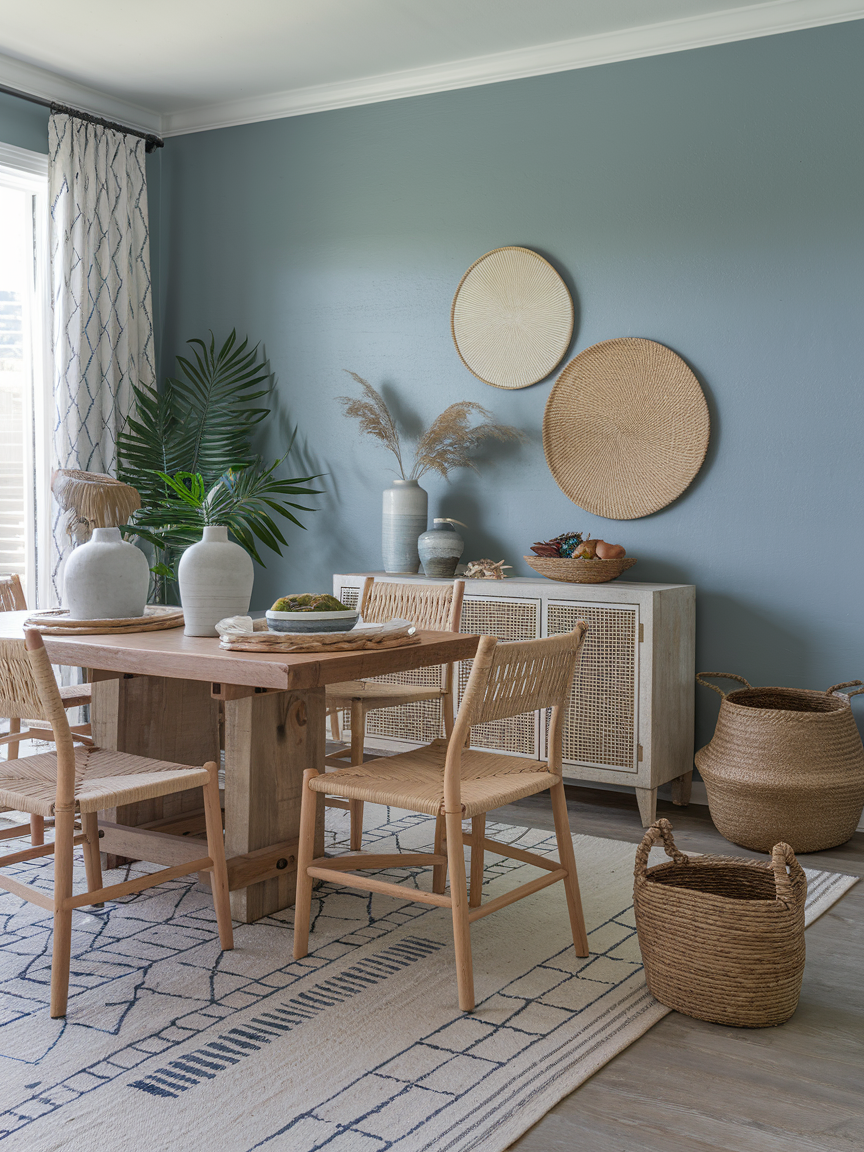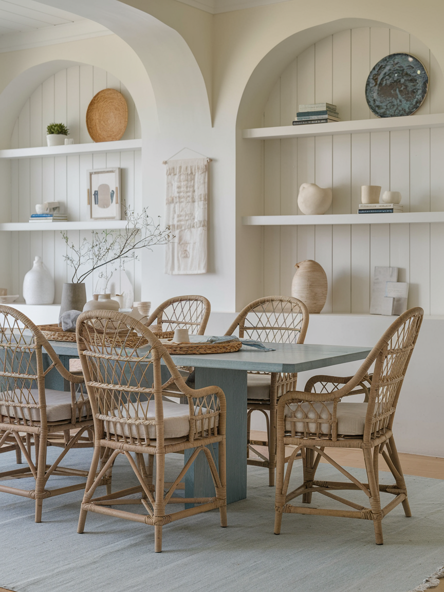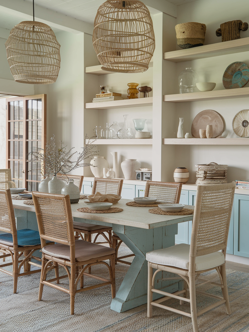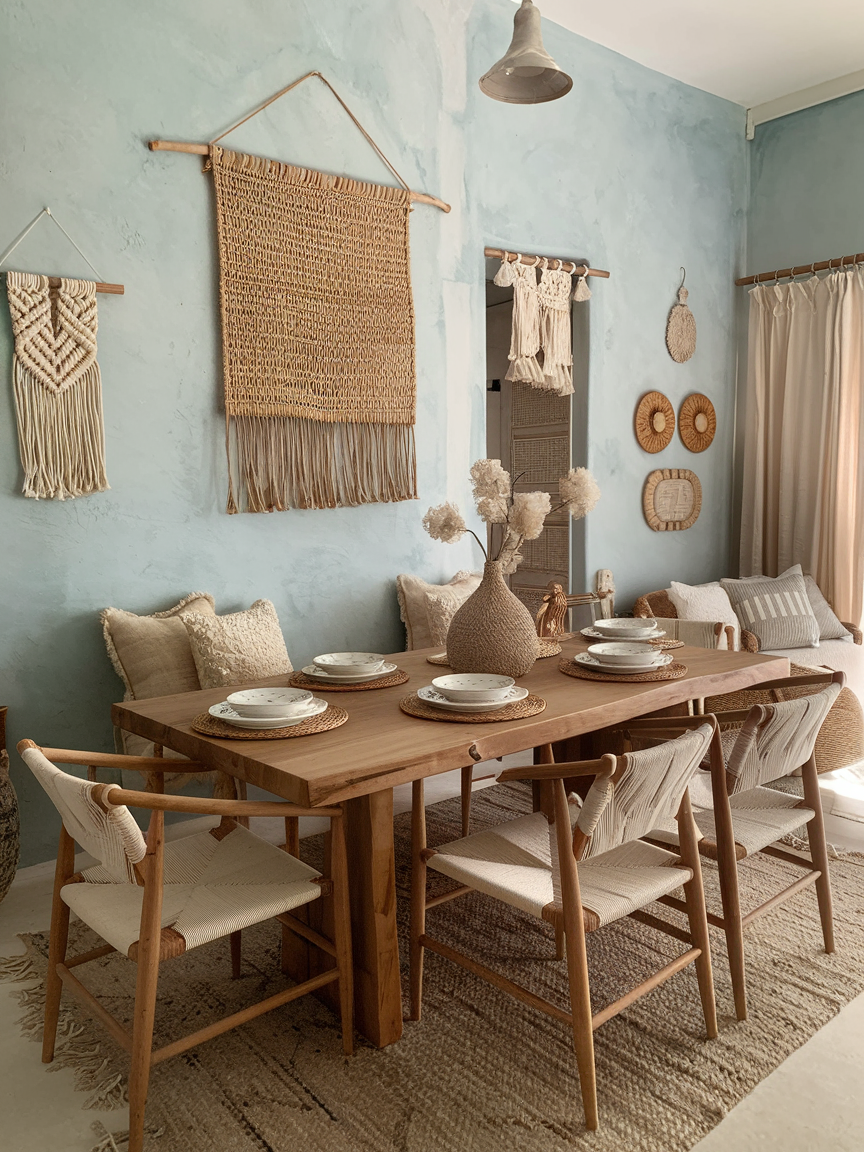 Soft blue accents subtly introduce the essence of the ocean into the dining room. Whether through cushions, ceramics, or decorative objects, these hues add a refreshing contrast to warm neutrals. The key is to use them sparingly so they enhance rather than dominate the space. These gentle tones evoke calmness and serenity, making the room feel more relaxing and balanced. Paired with natural textures, soft blue accents create a harmonious blend of coastal freshness and bohemian warmth.