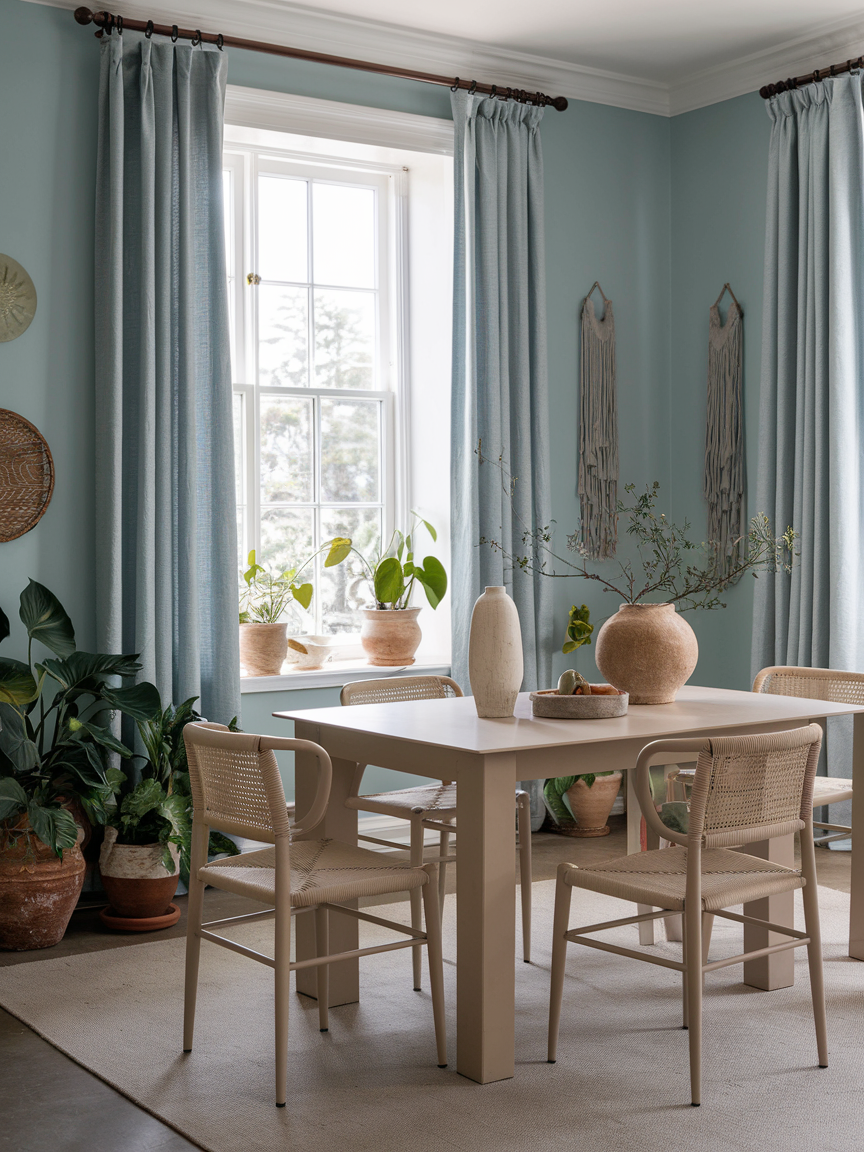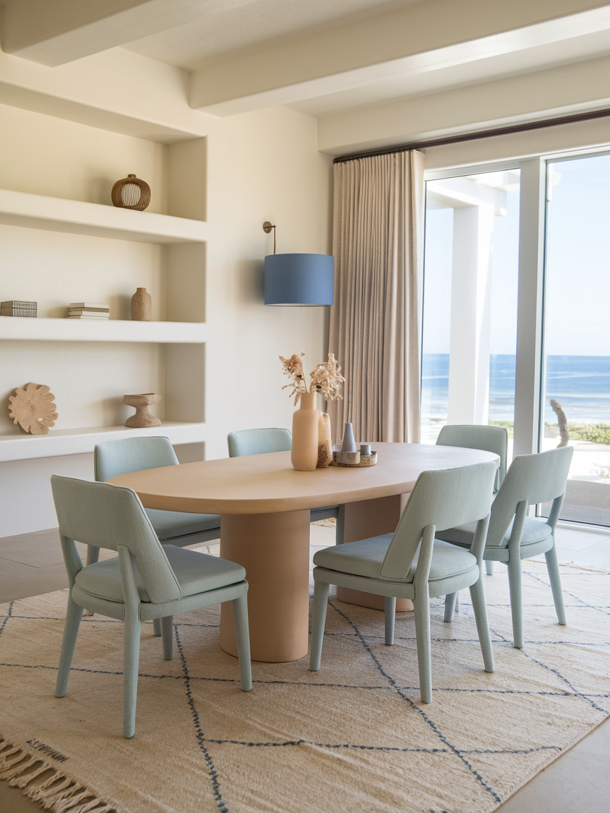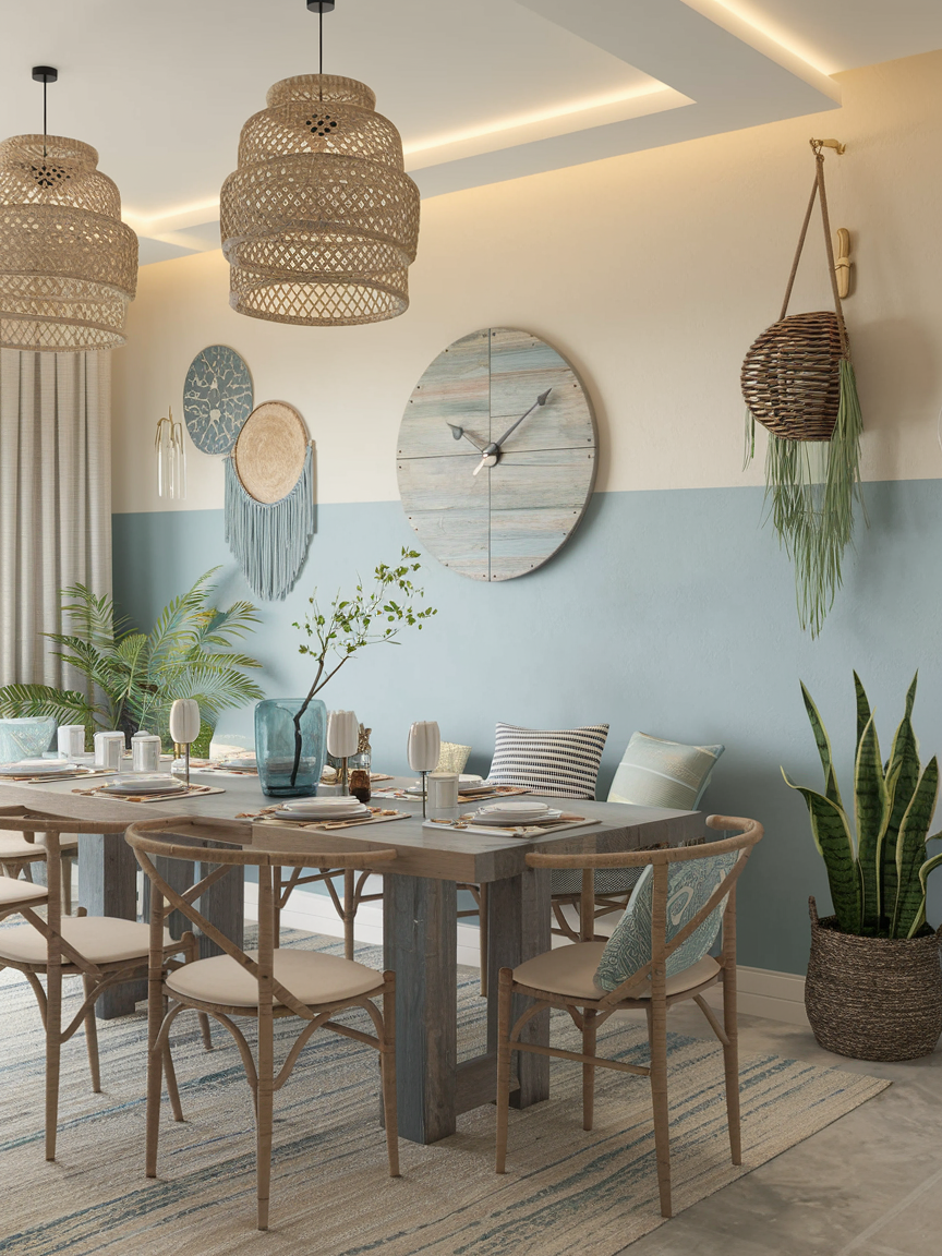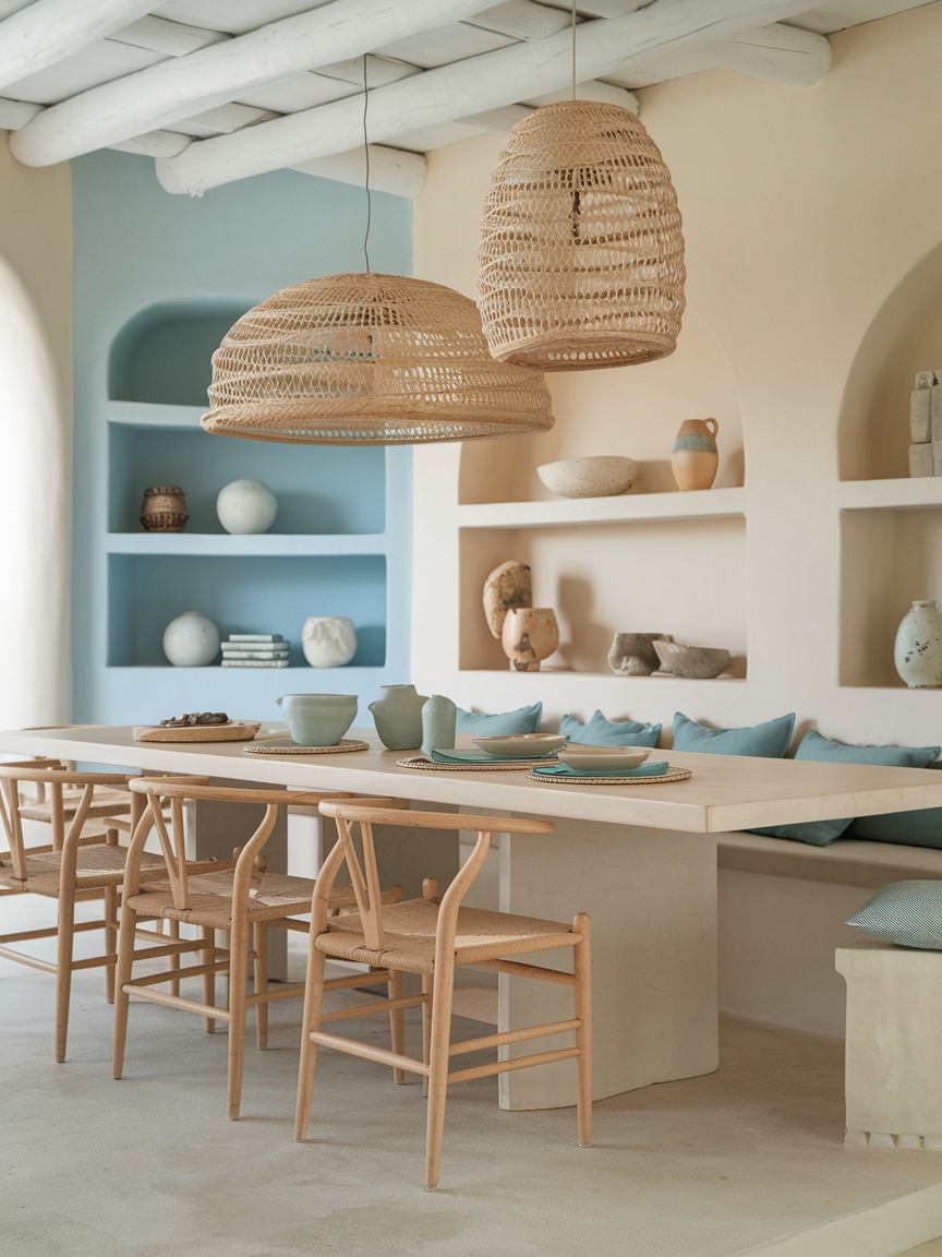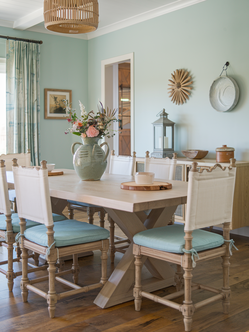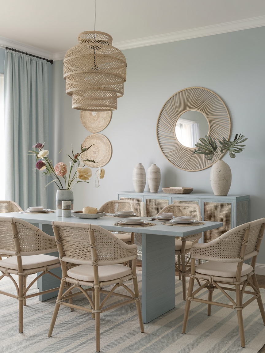 Soft blue accents subtly introduce the essence of the ocean into the dining room. Whether through cushions, ceramics, or decorative objects, these hues add a refreshing contrast to warm neutrals. The key is to use them sparingly so they enhance rather than dominate the space. These gentle tones evoke calmness and serenity, making the room feel more relaxing and balanced. Paired with natural textures, soft blue accents create a harmonious blend of coastal freshness and bohemian warmth.