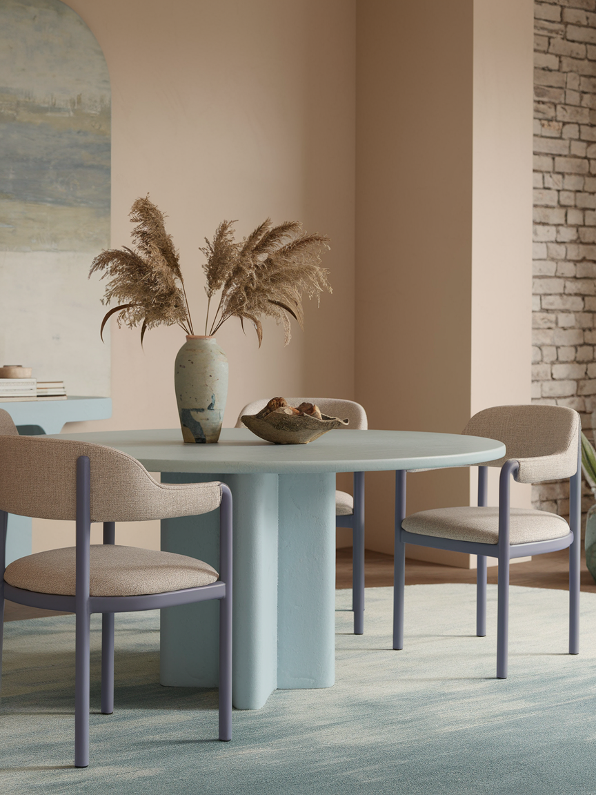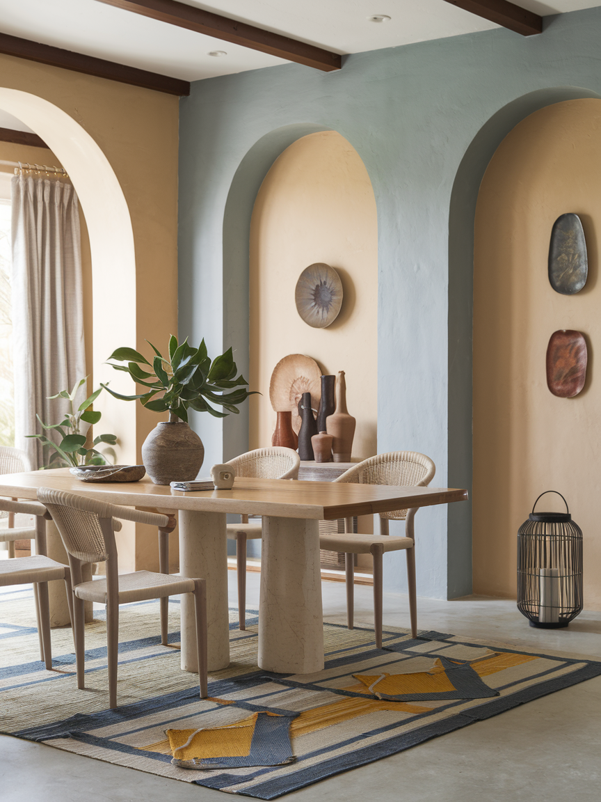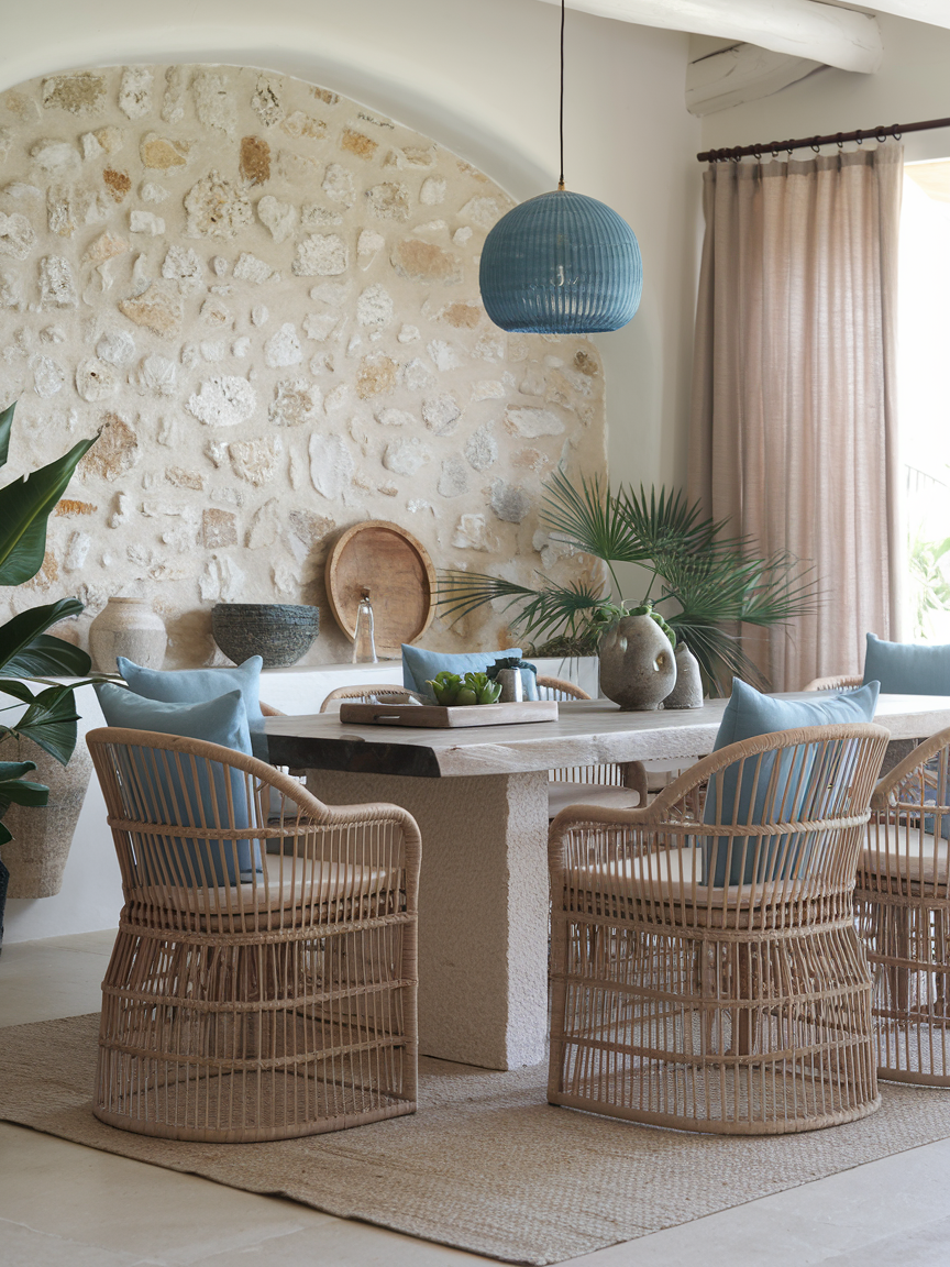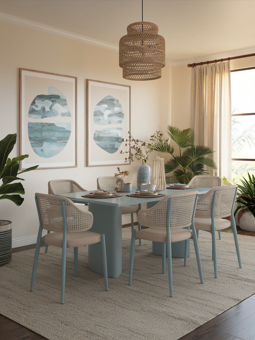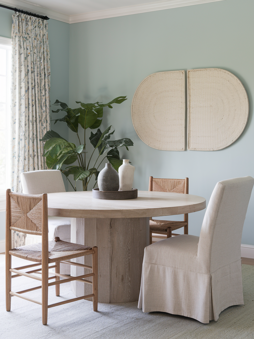 Soft blue accents subtly introduce the essence of the ocean into the dining room. Whether through cushions, ceramics, or decorative objects, these hues add a refreshing contrast to warm neutrals. The key is to use them sparingly so they enhance rather than dominate the space. These gentle tones evoke calmness and serenity, making the room feel more relaxing and balanced. Paired with natural textures, soft blue accents create a harmonious blend of coastal freshness and bohemian warmth.