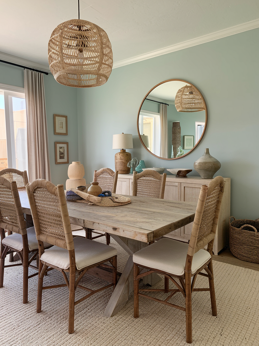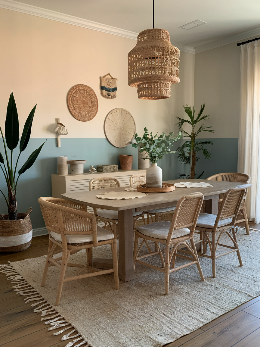 A well-designed boho coastal dining room blends organic materials with casual elegance to achieve a balanced and inviting look. Woven chairs, wooden tables, linen textiles, and subtle patterns work together to add depth without overwhelming the space. Gentle contrasts, natural light, and thoughtful styling choices help maintain a cohesive atmosphere that feels relaxed yet visually engaging.