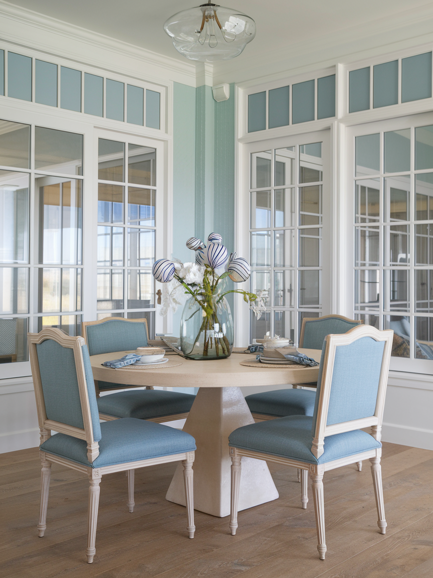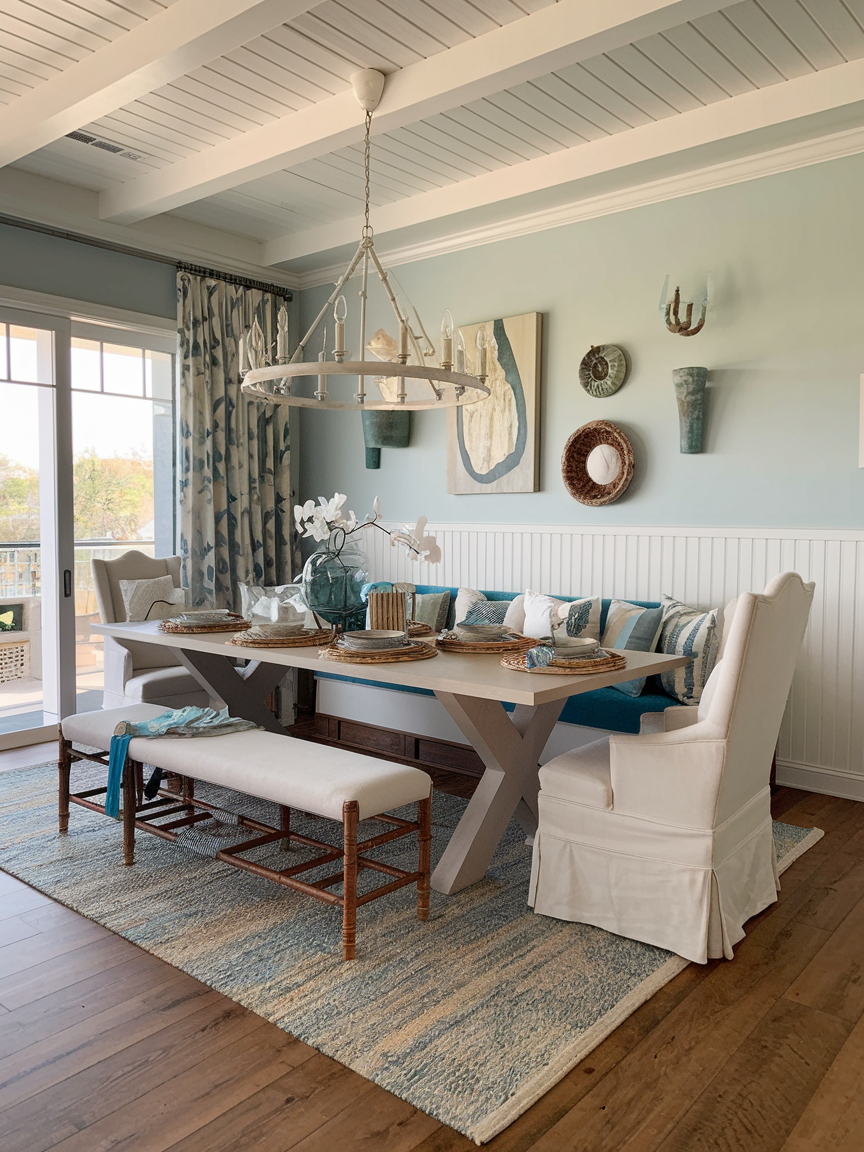 A neutral base layered with coastal hues creates a serene and visually cohesive dining space. Soft whites, warm creams, and sandy beiges establish a calming foundation, while accents of muted blue, seafoam green, or dusty aqua introduce a gentle coastal influence. This palette reflects natural elements like the ocean and shoreline, making the room feel peaceful and refreshing. The subtle color variations prevent the space from feeling flat while maintaining harmony. This approach also allows flexibility, making it easy to update decor seasonally without disrupting the overall aesthetic.