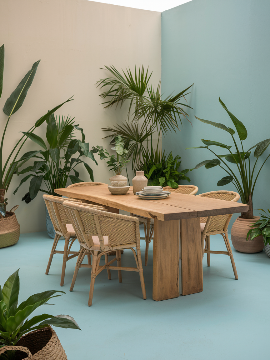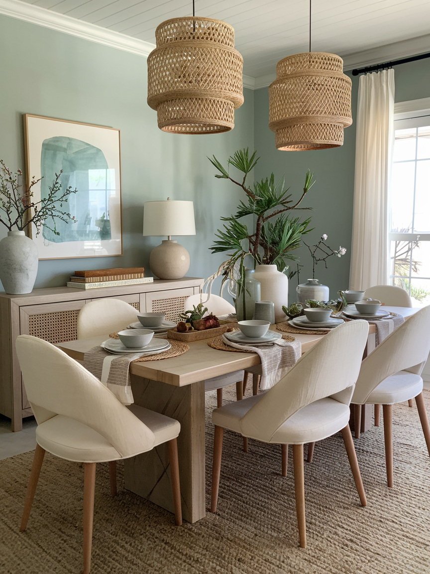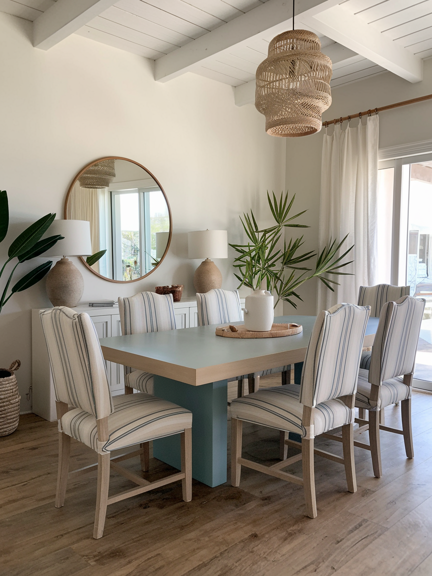 A light wood dining table acts as the heart of a boho coastal dining room, setting a warm and organic foundation that instantly makes the space feel grounded yet airy. Materials like oak, ash, or pine introduce soft grain patterns that add visual texture without overwhelming the design. The light tone reflects natural light beautifully, helping the room feel more open and spacious. Over time, the wood develops character, giving the dining area a lived-in charm that feels authentic and welcoming. Pairing it with neutral textiles and woven accents enhances its natural beauty, creating a balanced space that feels both relaxed and thoughtfully styled.