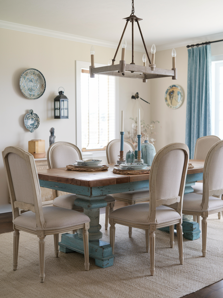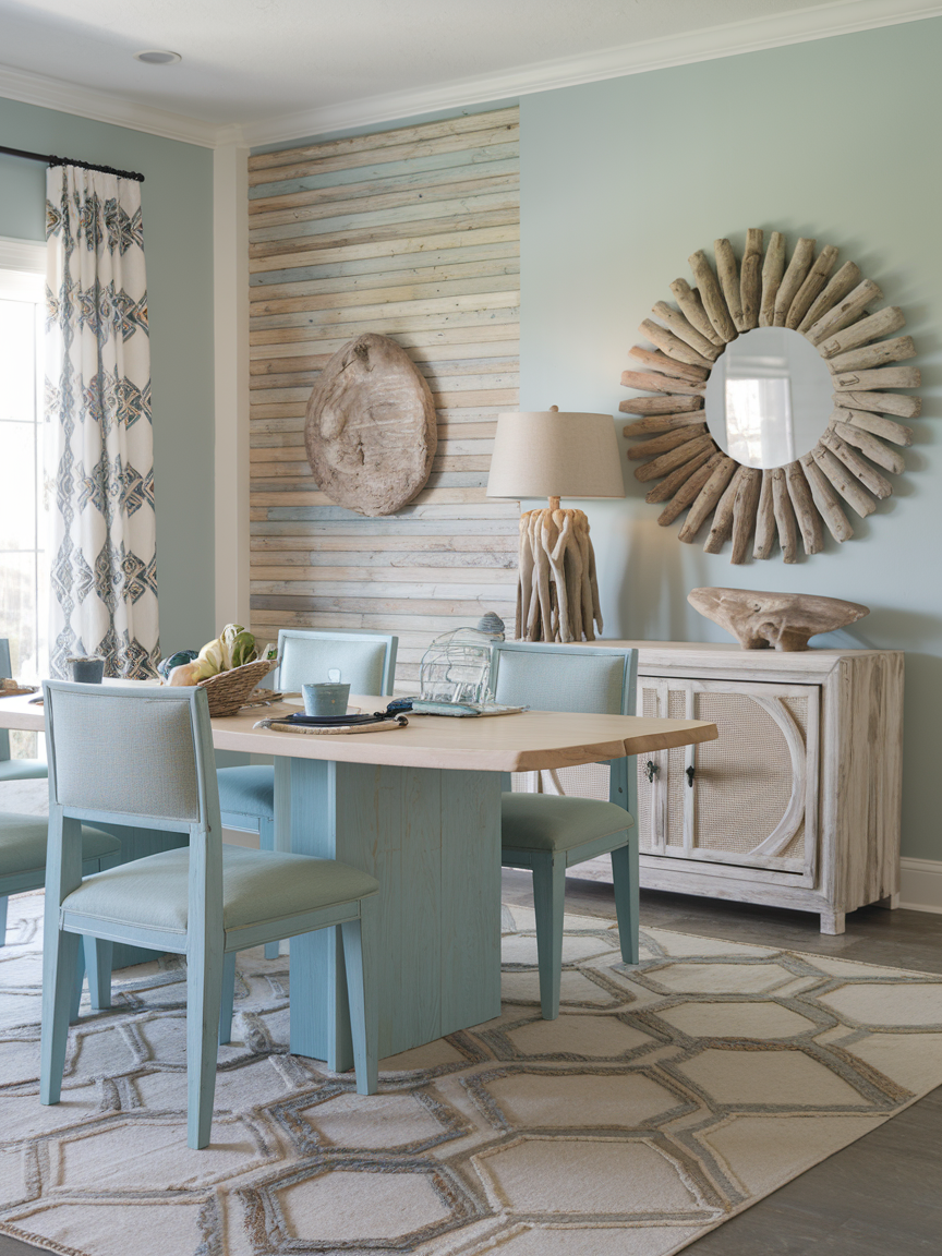 Coastal-inspired artwork adds personality while reinforcing the breezy theme of the dining room. Think soft ocean landscapes, abstract wave patterns, or minimalist seascapes in muted tones. These pieces create a calming focal point without overwhelming the space. Keeping frames simple, such as natural wood or white, maintains the relaxed aesthetic. Artwork not only enhances visual interest but also ties the entire theme together, making the dining room feel thoughtfully curated and emotionally connected to the coast.