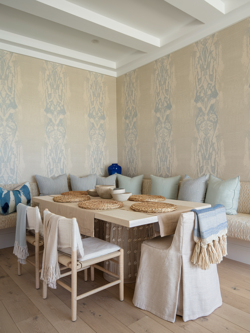 Layering textiles is essential for adding warmth and softness to a boho coastal dining room. Linen table runners, woven placemats, and textured seat cushions introduce depth without cluttering the space. These elements create a cozy, inviting atmosphere that encourages lingering at the table. Subtle details like tassels, fringes, or light patterns enhance the bohemian feel while maintaining a relaxed coastal look. Mixing textures rather than bold colors keeps the design cohesive yet interesting. Thoughtfully layered textiles make the dining area feel comfortable, stylish, and effortlessly welcoming.