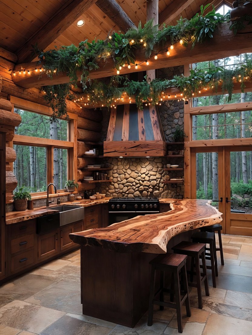 This rustic luxury kitchen captures the essence of a cozy retreat deep in nature. The centerpiece is a stunning curved live-edge wooden island that showcases the organic beauty of natural wood while offering integrated seating for casual dining and gathering. Dark wood countertops enhance the rich, earthy tone, while a river stone backsplash introduces texture and a handcrafted feel. Overhead, exposed wooden beams are softened with cascading greenery and delicate string lights, creating a warm, whimsical ambiance. A black stove paired with a custom wooden and stone range hood anchors the space with rustic elegance. Large windows frame peaceful forest views, filling the kitchen with natural light and strengthening the connection between indoors and the surrounding landscape. The overall atmosphere feels inviting, grounded, and perfect for slow mornings and cozy evenings.
