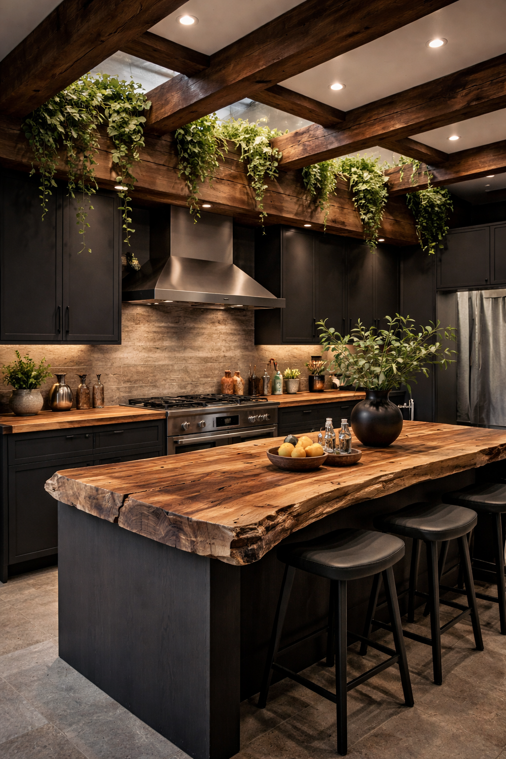 For those who love contemporary design but still crave warmth, this sleek organic kitchen offers the perfect balance. Deep grey or black cabinetry creates a bold, sophisticated foundation, while a striking live-edge wooden island brings natural character and visual contrast. Thick wood slab countertops highlight raw textures and craftsmanship, giving the space an earthy yet refined presence. Above the workspace, exposed wooden beams support an arrangement of trailing green plants that soften the modern lines and add life to the design. Warm recessed lighting enhances the wood grain and greenery, creating a calm and inviting glow. Integrated stainless steel appliances maintain a seamless, uncluttered appearance. The overall aesthetic feels modern, elegant, and deeply connected to nature—ideal for homeowners who appreciate minimalism without sacrificing warmth or personality.
