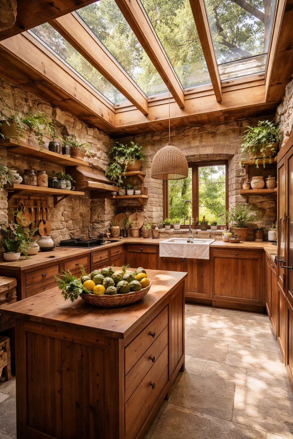 This cozy rustic kitchen blends natural materials with thoughtful architectural details to create a peaceful, grounded environment. Exposed stone walls provide timeless texture and durability, beautifully complemented by warm wooden cabinetry and matching countertops. One of the most captivating features is the large wooden-framed skylight, which floods the space with natural light and offers views of treetops above, bringing the outdoors inside. Built-in wooden shelves nestled within the stone walls display potted plants, ceramics, and everyday kitchen essentials, adding both charm and practicality. Light-colored stone or tile flooring keeps the room feeling open and airy while maintaining the earthy aesthetic. The overall design feels harmonious, natural, and serene—perfect for anyone who wants their kitchen to feel like a peaceful extension of the surrounding landscape.