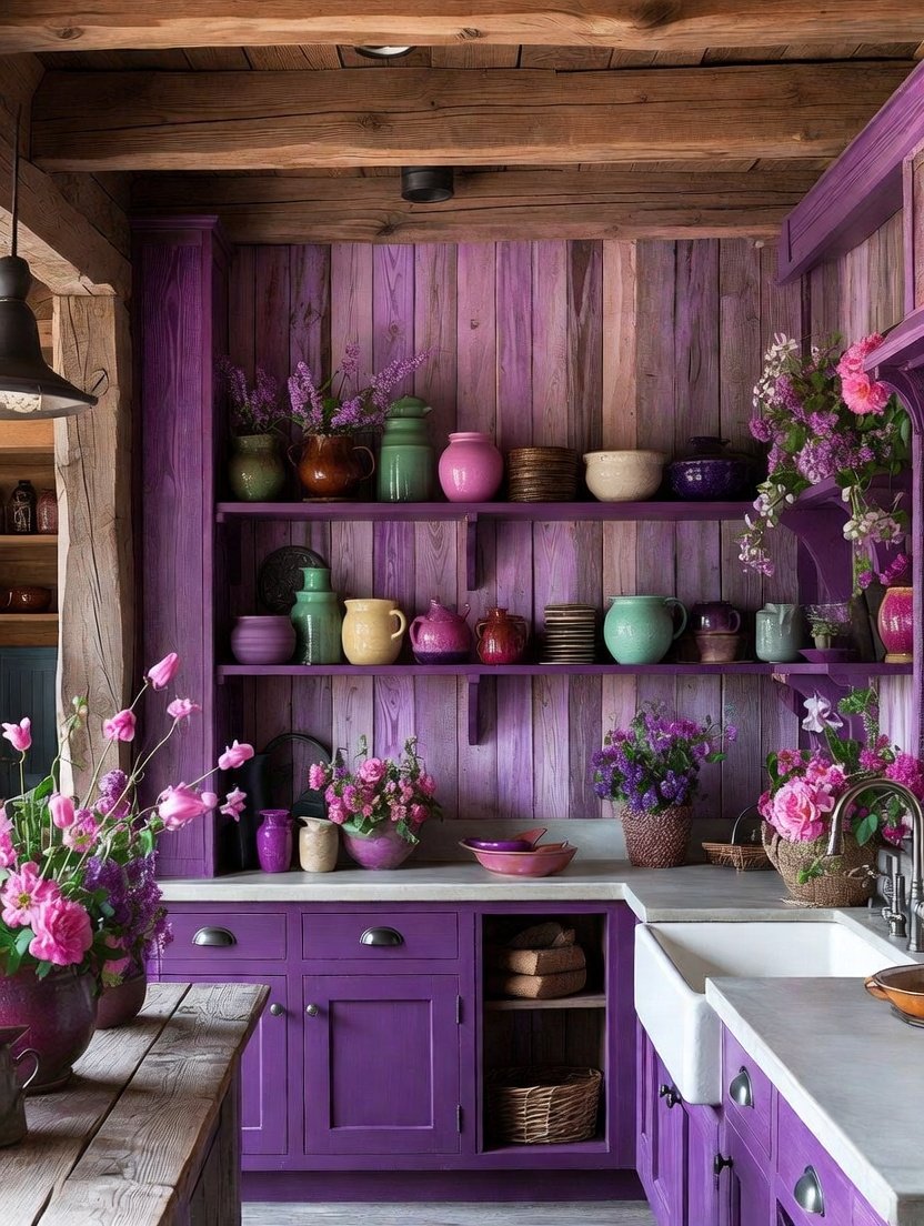 This enchanting kitchen transforms rustic design into something playful and magical through a bold yet elegant color palette. Rich eggplant-purple cabinetry creates a dramatic focal point, while lighter purple tones and natural wood wall planks add depth and warmth. Open shelving showcases colorful pottery and decorative pieces, giving the space a curated, artistic feel. Light grey countertops provide balance and prevent the deeper tones from feeling too heavy. Fresh floral arrangements in shades of pink, lavender, and violet are placed throughout the kitchen, enhancing the garden-inspired atmosphere. A classic farmhouse sink and a sturdy rustic wooden table complete the look, making the space both charming and functional. The overall effect feels like stepping into a storybook kitchen—creative, inviting, and full of personality.