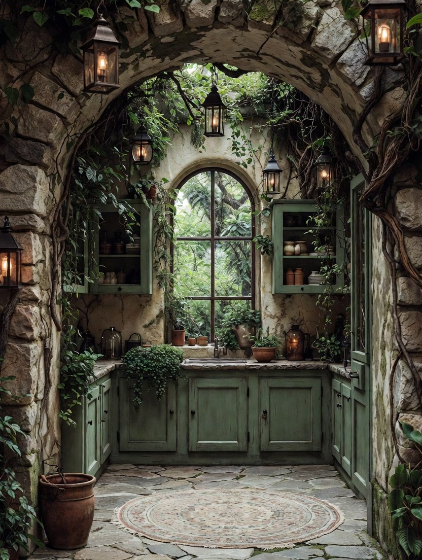 This magical kitchen feels like a hidden sanctuary tucked within nature. Framed by a beautiful stone archway, the space features textured walls in natural stone and soft mossy tones that create a timeless, organic backdrop. Muted earthy green cabinetry blends seamlessly with the surrounding palette, enhancing the garden-inspired aesthetic. Overhead, lush vines and cascading foliage bring movement and life, while an arched window reveals even more greenery outside, strengthening the indoor-outdoor connection. Rustic lanterns suspended from the stone ceiling cast a warm, golden glow that adds to the enchanting atmosphere. Large, irregular stone floor tiles reinforce the natural theme, and a round patterned rug softens the space with comfort and visual interest. The result is a fairytale-like kitchen that feels peaceful, intimate, and beautifully connected to the rhythms of nature.