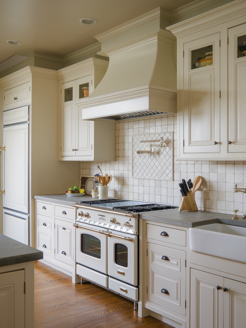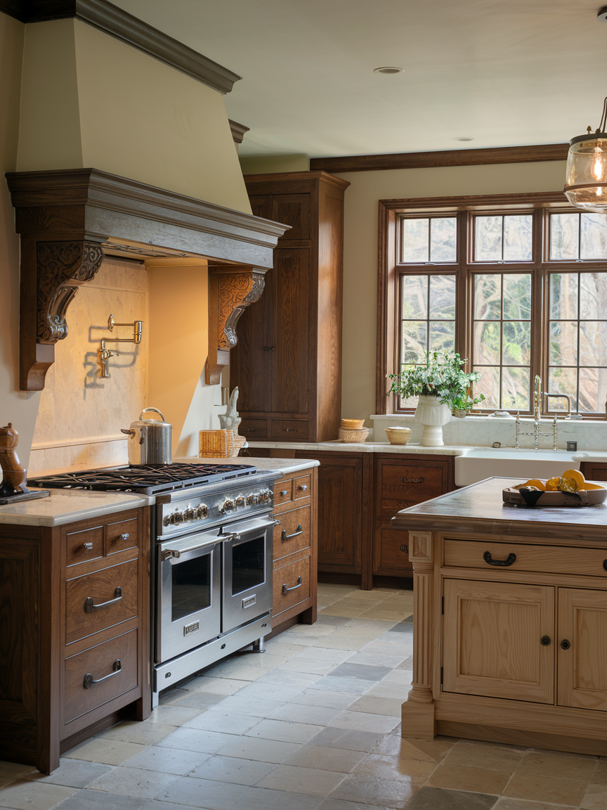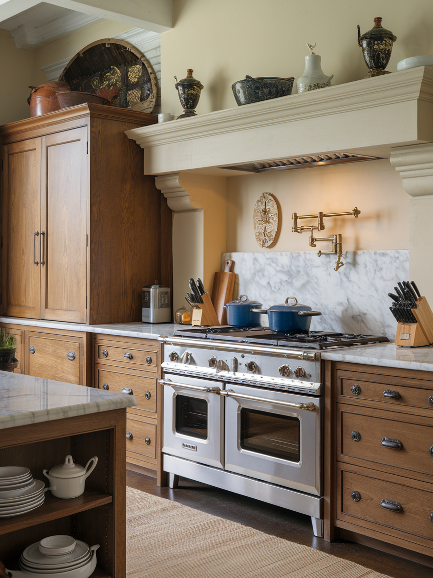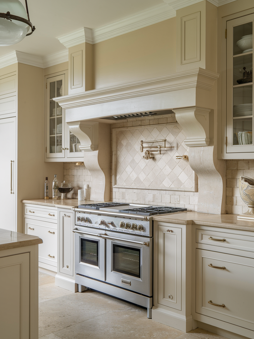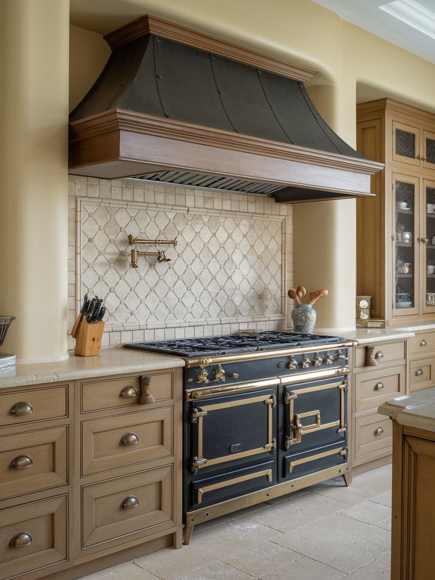 In traditional kitchens, the range hood often becomes a central design feature rather than a purely functional appliance cover. Custom hoods crafted from wood, plaster, stone, or painted finishes add architectural presence and create a beautiful focal point above the cooking area. Decorative molding, corbels, or carved trim enhance the traditional aesthetic while tying the hood into the cabinetry design. This feature helps anchor the cooking zone and adds visual weight that balances the rest of the space. A thoughtfully designed range hood transforms a practical necessity into an elegant centerpiece that elevates the entire kitchen.