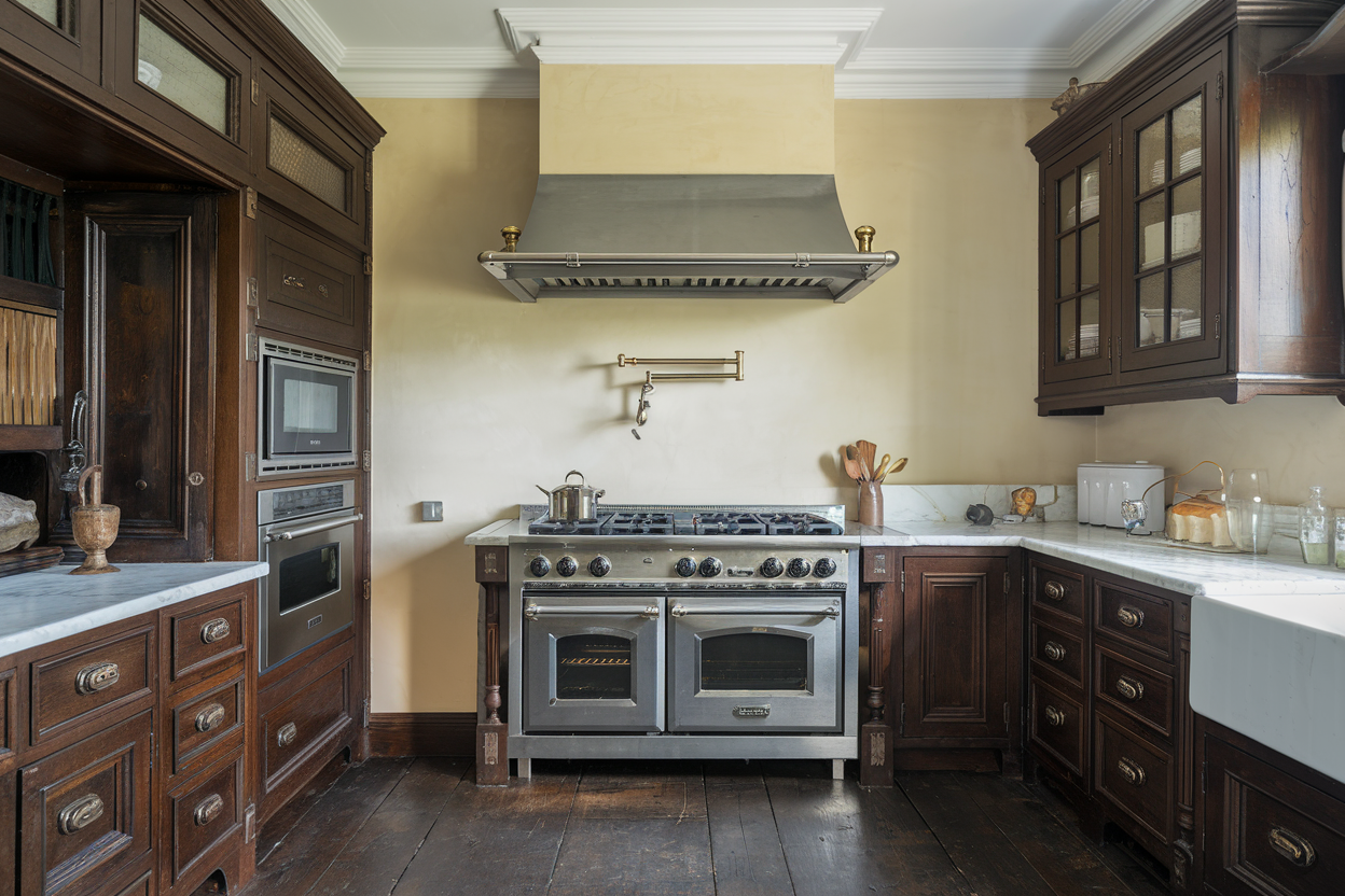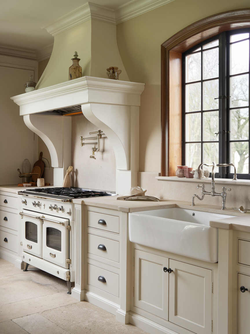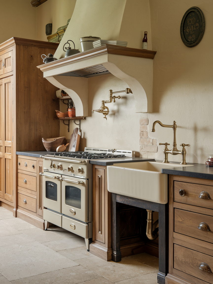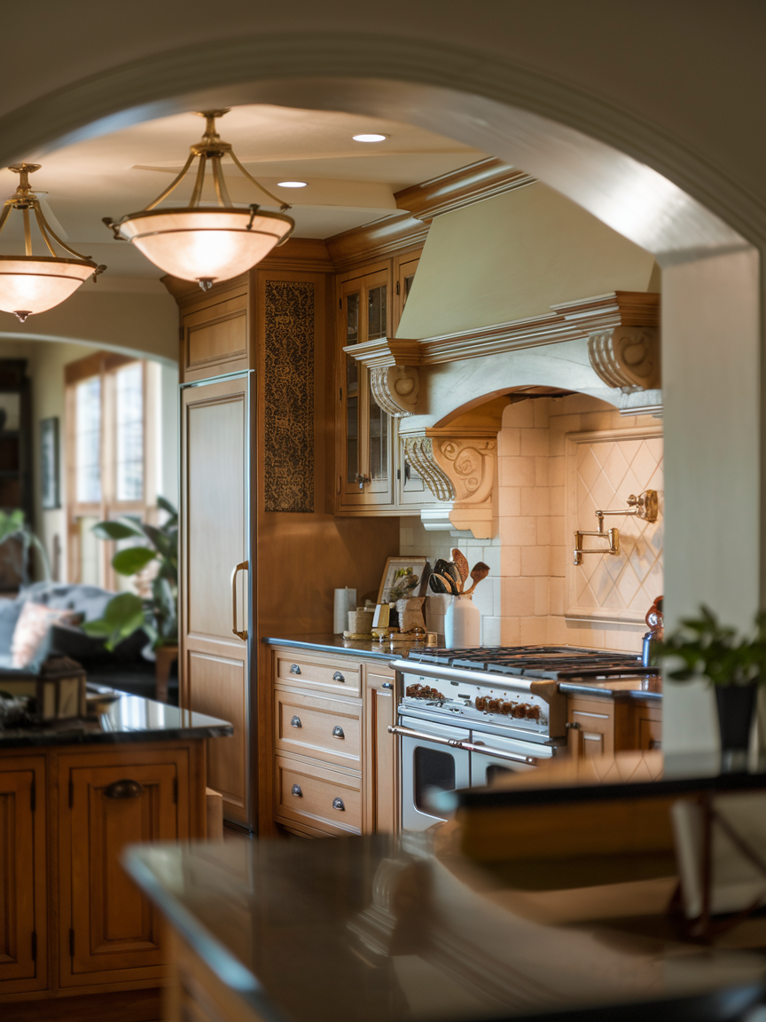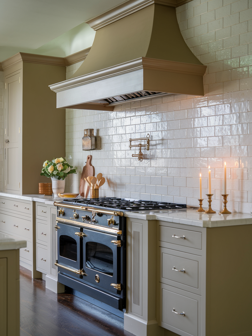 In traditional kitchens, the range hood often becomes a central design feature rather than a purely functional appliance cover. Custom hoods crafted from wood, plaster, stone, or painted finishes add architectural presence and create a beautiful focal point above the cooking area. Decorative molding, corbels, or carved trim enhance the traditional aesthetic while tying the hood into the cabinetry design. This feature helps anchor the cooking zone and adds visual weight that balances the rest of the space. A thoughtfully designed range hood transforms a practical necessity into an elegant centerpiece that elevates the entire kitchen.