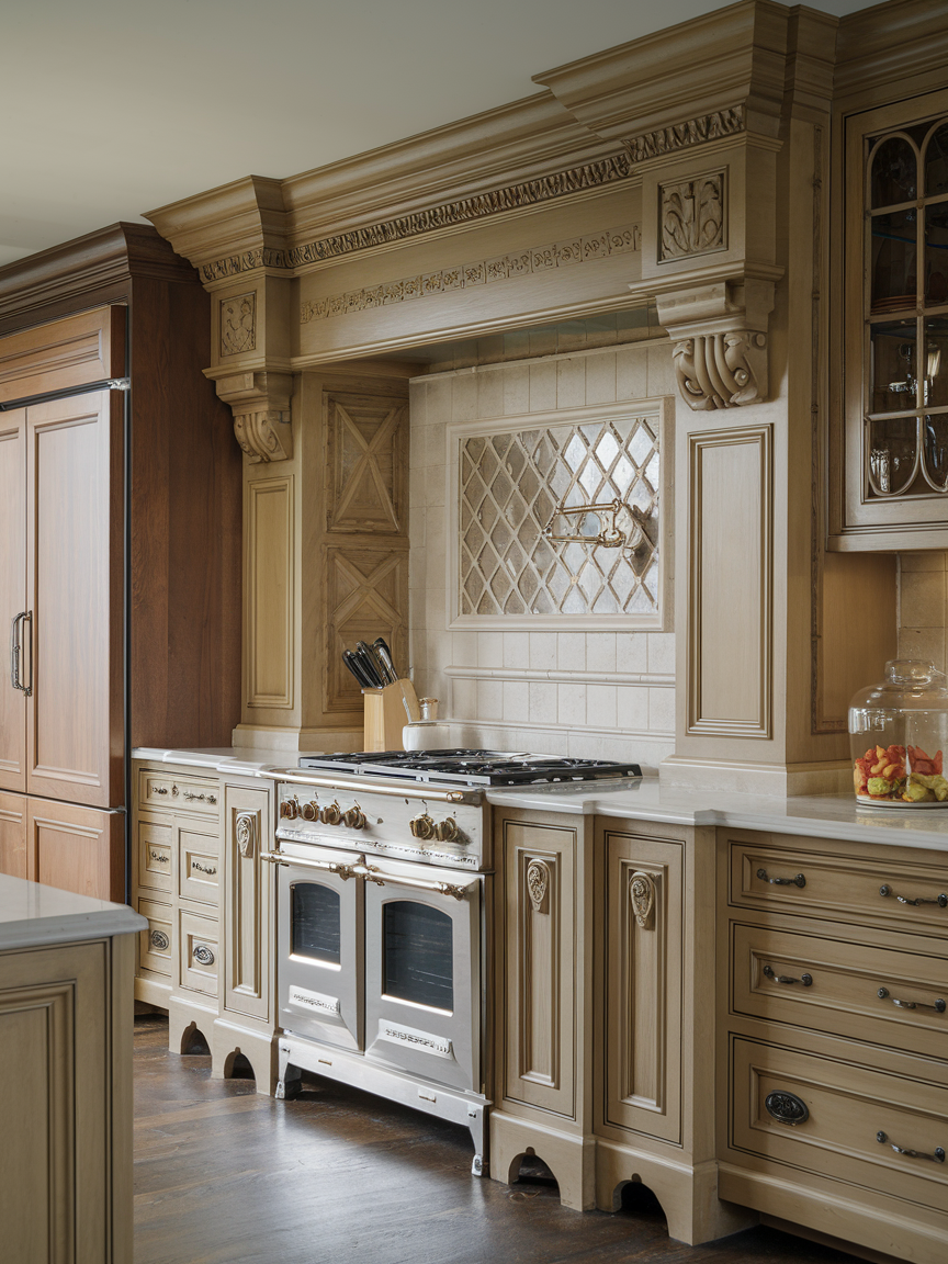 Cabinetry that mimics the look of handcrafted furniture adds personality and refinement. Features such as decorative legs, carved details, inset doors, or decorative feet give the kitchen a curated, custom feel. These thoughtful elements make the space appear thoughtfully designed rather than mass-produced, blending beauty with everyday functionality.