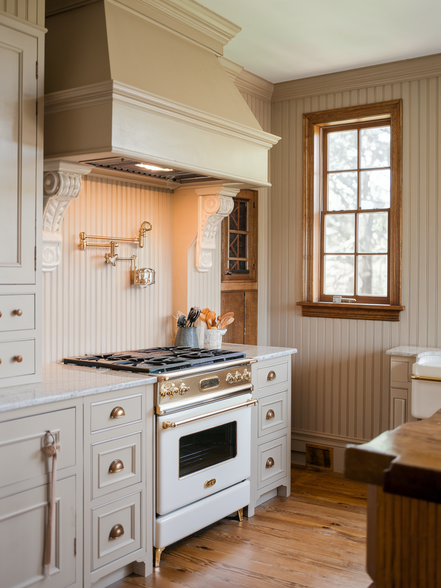 Beadboard and paneled surfaces are classic elements that add depth, texture, and a handcrafted feel to traditional kitchens. Installed on walls, islands, cabinet doors, or even ceiling areas, these details introduce subtle visual interest without overwhelming the design. Painted beadboard in soft white or cream creates a fresh cottage-inspired look, while stained wood paneling adds warmth and richness. These architectural touches prevent large surfaces from appearing flat and reinforce the sense of craftsmanship that defines traditional style. The result is a kitchen that feels layered, cozy, and thoughtfully designed, with just the right balance of elegance and personality.