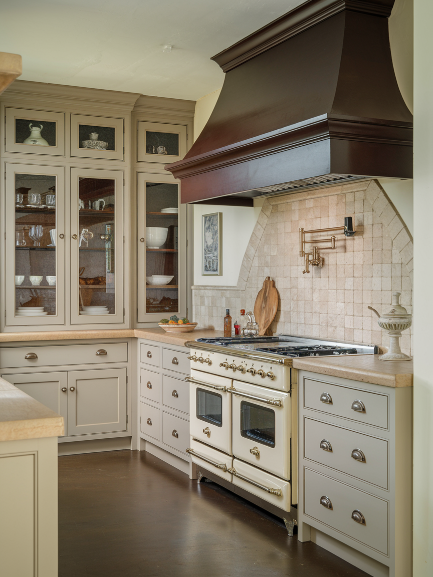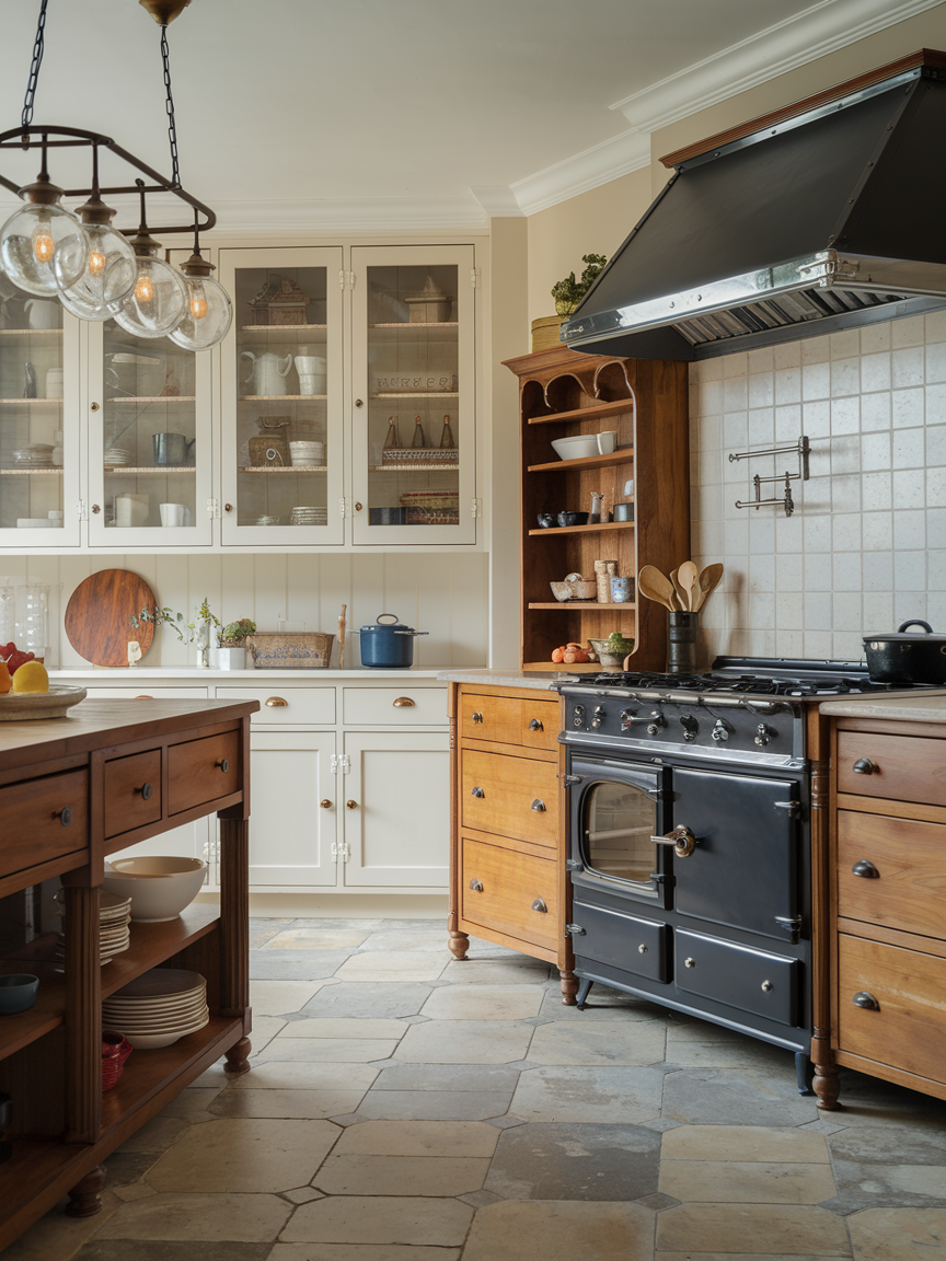 Color palettes inspired by nature, warm wood tones, and soft neutrals help create a cozy and inviting atmosphere. Stone countertops, glass-front cabinets, and classic backsplashes bring texture and depth while maintaining a balanced and harmonious feel. Carefully chosen décor, from vintage-inspired accents to traditional furniture pieces, enhances the overall sense of warmth and sophistication.