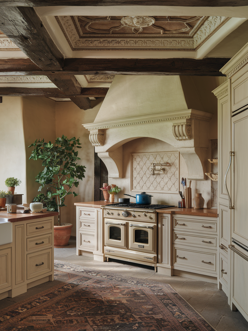 A traditional kitchen doesn’t stop at eye level, the ceiling can become an important design feature as well. Exposed wooden beams introduce warmth and rustic elegance, while coffered ceilings or detailed trim add depth and sophistication. These elements draw the eye upward, making the room feel taller and more spacious. Decorative ceilings also help the kitchen feel more like a thoughtfully designed living space rather than a purely functional area. By adding architectural detail above, you create a layered environment that feels rich, inviting, and visually complete.