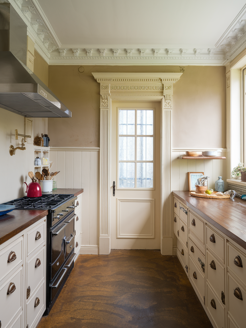 Crown molding is a small architectural feature that makes a significant visual impact. Installed along the tops of cabinets or where walls meet the ceiling, it creates a polished, finished look that defines traditional elegance. This detail helps cabinetry feel more substantial and custom-built, adding height and sophistication to the overall design. Whether simple or layered, crown molding acts like a finishing frame that completes the kitchen and reinforces its timeless character.