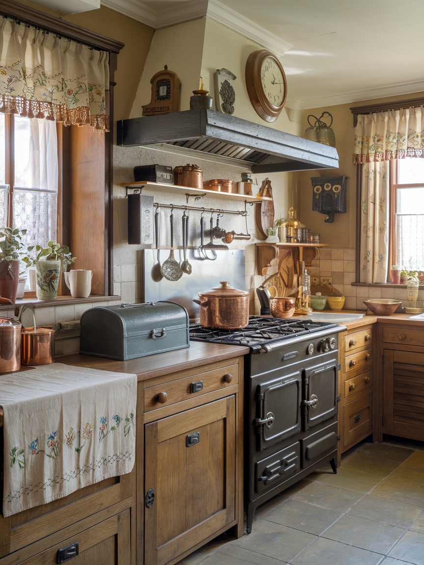 Antique clocks, copper cookware, ceramic canisters, woven textiles, and heirloom pieces create a sense of history and authenticity. Open shelves displaying collected items or decorative trays on countertops help the space feel lived-in rather than staged. These personal touches soften the formality of cabinetry and stone surfaces, making the kitchen feel warm, welcoming, and uniquely yours. Vintage décor also allows you to refresh the look over time without major renovations, keeping the space evolving while maintaining its timeless charm.