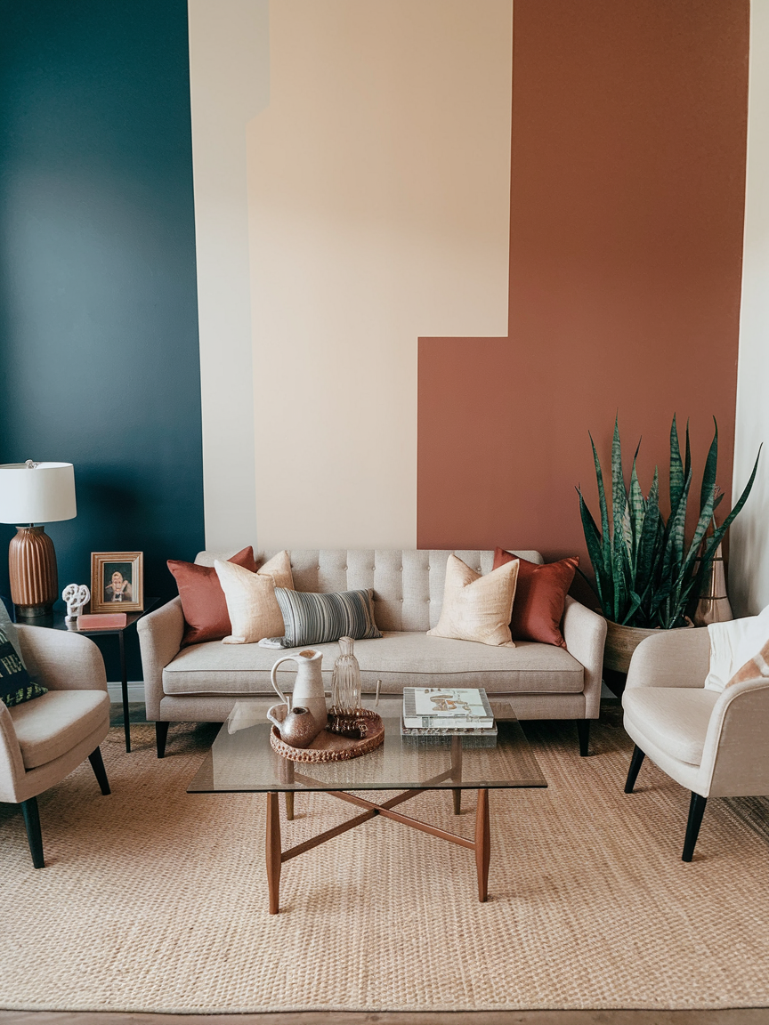 A color block accent wall instantly energizes your living room by introducing bold sections of contrasting or complementary hues. Instead of painting the entire wall one shade, divide the surface into geometric segments using painter’s tape to create clean, modern lines. You can combine two or three colors, such as warm terracotta with soft beige or navy paired with muted blush, to create a playful yet balanced look. This approach works especially well in minimalist spaces that need a pop of personality without adding extra decor. The structured design adds visual interest while keeping the overall space feeling organized. Pair the wall with neutral furniture and simple accessories so the color blocking becomes the main focal point. This idea is perfect for homeowners who want a creative transformation that feels modern, artistic, and easy to update in the future.