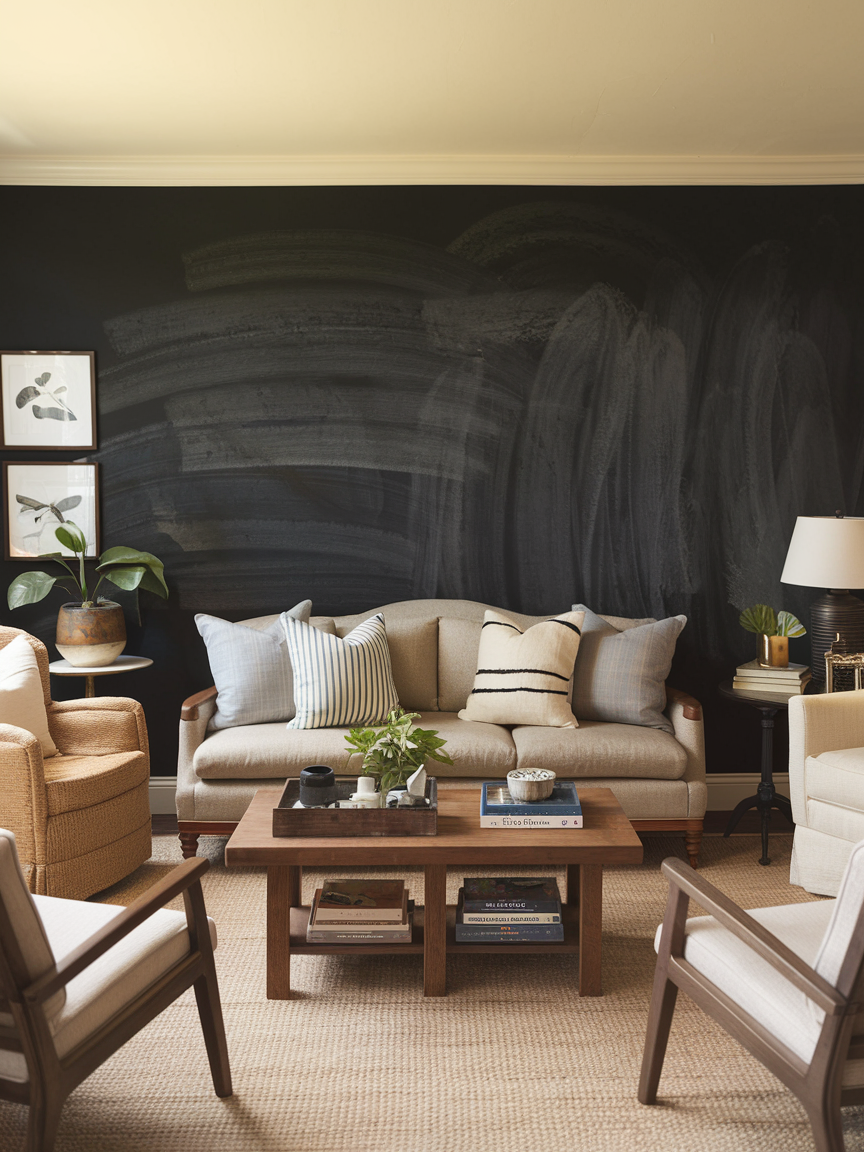A chalkboard accent wall adds an interactive and fun element to your living room, making the space feel creative and family-friendly. This idea works especially well in homes where the living room doubles as a shared activity area. Use the wall to display seasonal art, inspirational quotes, doodles, or even weekly reminders. The matte black surface creates a bold contrast that also works as a stylish modern feature when left minimal. Frame the chalkboard area with molding or keep it a full wall for maximum impact. Pair it with warm wood furniture and soft textiles to balance the dark tone. This accent wall is ideal for those who want a design that evolves over time, offering both visual interest and a playful way to personalize the space.