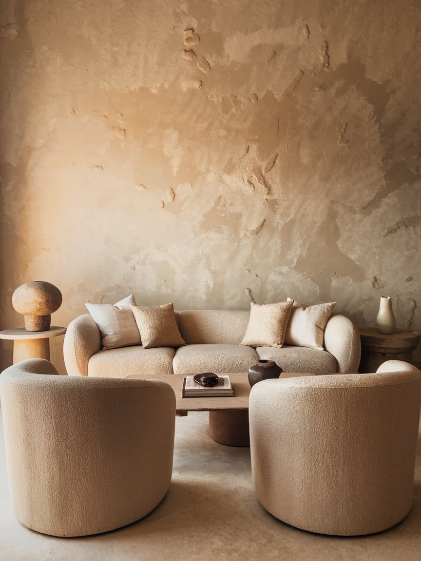 A textured plaster accent wall adds subtle dimension and an organic, handcrafted feel to your living room. Finishes such as limewash, Venetian plaster, or concrete-style coatings create movement through soft variations in tone and texture. This design works beautifully in neutral palettes like warm beige, soft gray, or earthy taupe, allowing the texture to become the focal point rather than bold color. The natural imperfections add depth and visual warmth, making the space feel more layered and inviting. Pair the wall with minimalist furniture, natural materials, and soft lighting to enhance the organic atmosphere. This approach is perfect for homeowners who want a playful textural element that feels modern, elegant, and timeless without overwhelming the room.