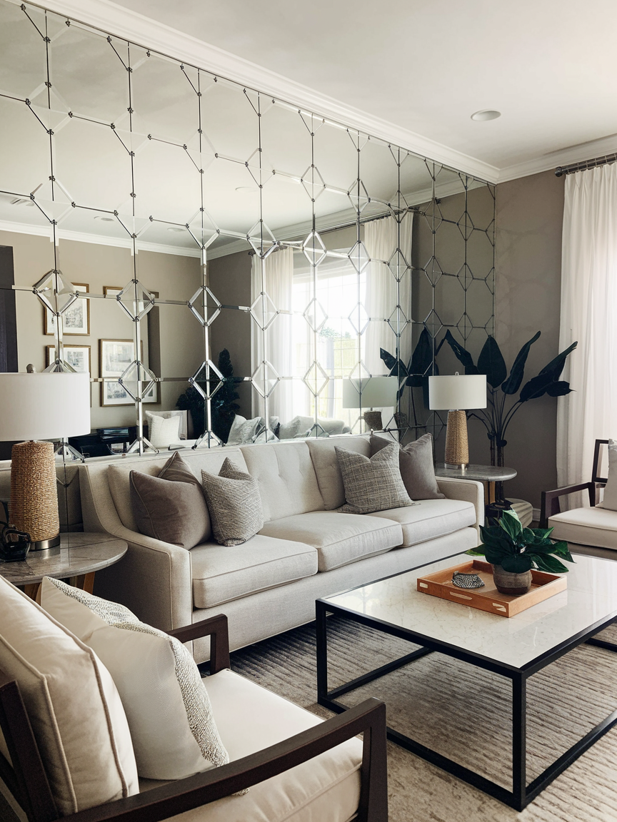A mirror panel accent wall is both stylish and practical, helping your living room feel brighter and more spacious. Large mirror sections or decorative mirrored tiles reflect natural and artificial light, making smaller spaces feel open and airy. This idea works especially well in apartments or compact living rooms where maximizing light is important. Choose clean geometric layouts or subtle grid designs to keep the look modern and polished. Pair the mirrored wall with neutral furniture and soft textures to avoid visual clutter. The reflective surface also enhances surrounding decor, making colors and lighting feel more dynamic. This accent wall adds a playful sense of luxury while improving the overall functionality and atmosphere of your living space.