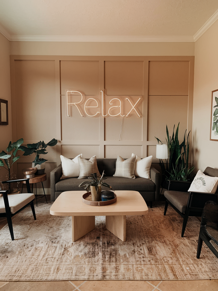 A neon sign accent wall adds personality, energy, and a modern artistic vibe to your living room. Choose a meaningful word, phrase, or simple symbol that reflects your lifestyle or mood. Soft LED neon lights in warm white, blush, or subtle colors create a stylish glow without overwhelming the space. This feature works beautifully against a painted accent wall or textured backdrop to enhance contrast. Pair it with minimalist furniture and cozy lighting to keep the overall look balanced. The soft illumination adds ambiance in the evening, making the living room feel more inviting and unique. This idea is perfect for creating a playful focal point that combines contemporary design with a personal touch.