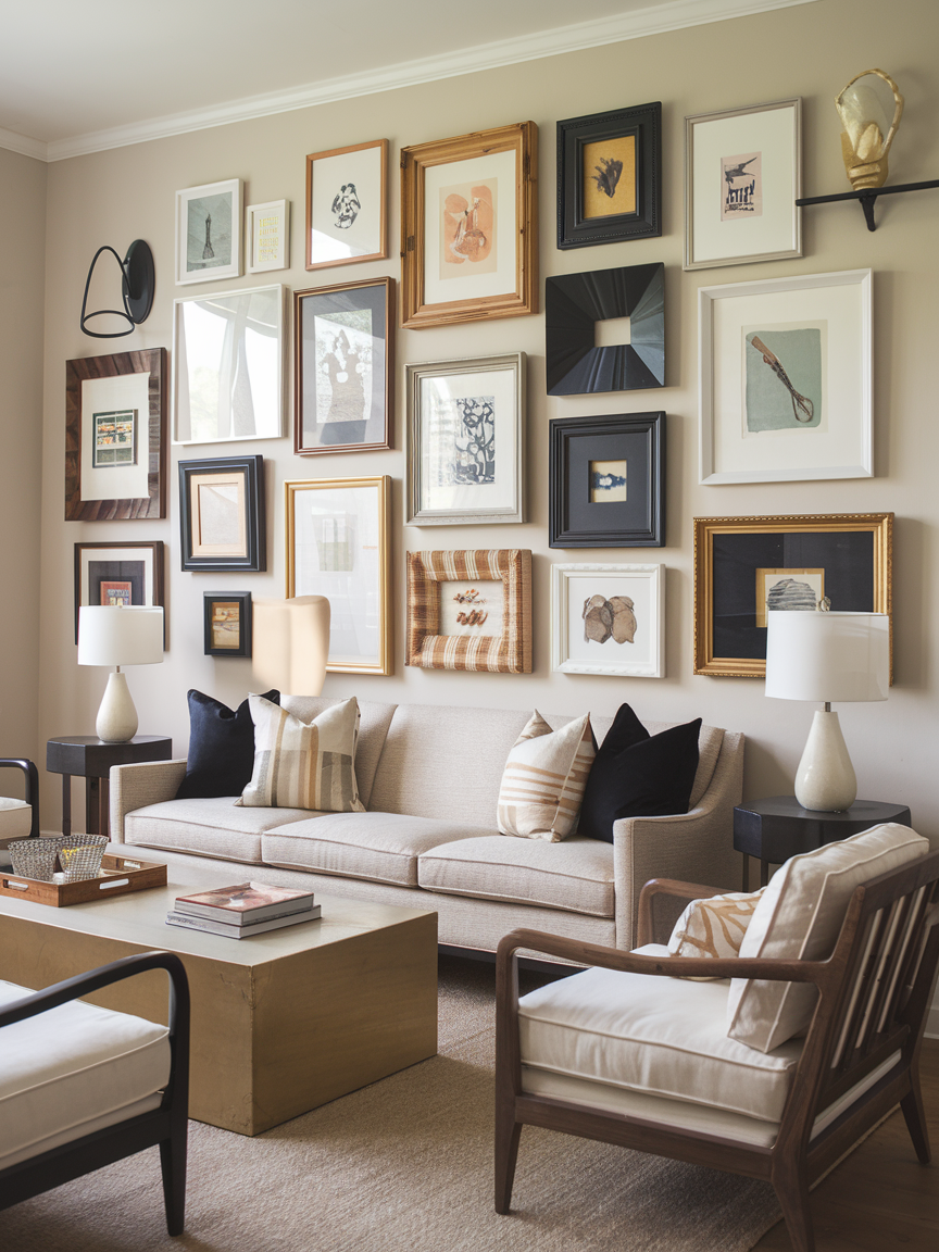 A mixed frame accent wall embraces variety and creativity by combining different frame styles, sizes, and finishes. Blend wood, metal, black, gold, or white frames to create a layered and collected look. Fill them with artwork, prints, textiles, or photographs to reflect your personality and interests. The key to keeping the design stylish is maintaining a cohesive color palette or theme throughout the display. This arrangement works best on a large focal wall where it can fully express its visual impact. Pair the wall with simple furniture and neutral tones so the artwork remains the main attraction. This playful design adds depth, character, and a curated feel that makes your living room look thoughtfully styled.