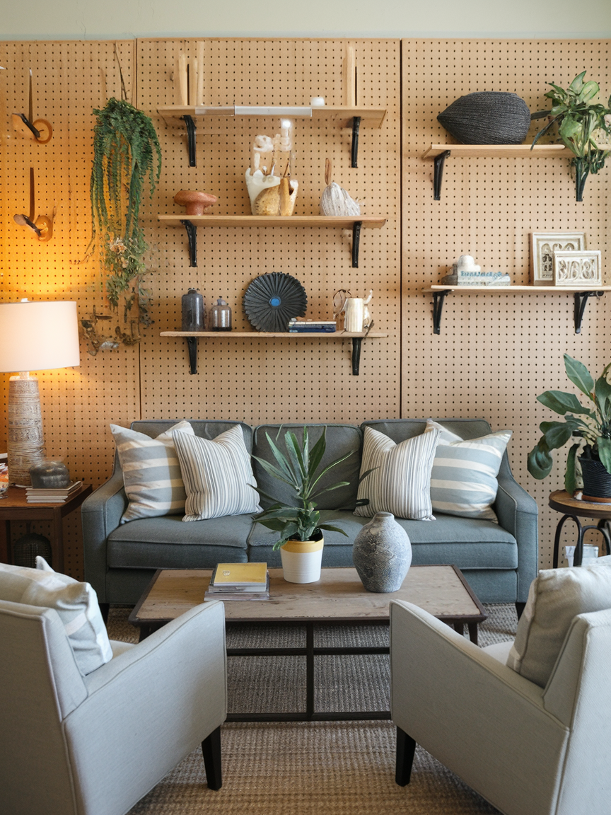 A pegboard accent wall offers a flexible and functional way to decorate your living room while keeping the design playful. Painted pegboards in soft neutrals or bold colors allow you to rearrange shelves, plants, and decor whenever you want a refresh. This idea works especially well in casual, modern, or creative homes where adaptability is important. Use the board to display small artwork, books, decorative objects, or hanging planters. The structured grid keeps the arrangement looking clean and organized, even as you change it over time. Pair the wall with simple furniture and warm textures to balance the practical design. This accent wall is perfect for homeowners who enjoy experimenting with styling while keeping the space visually interesting and personalized.