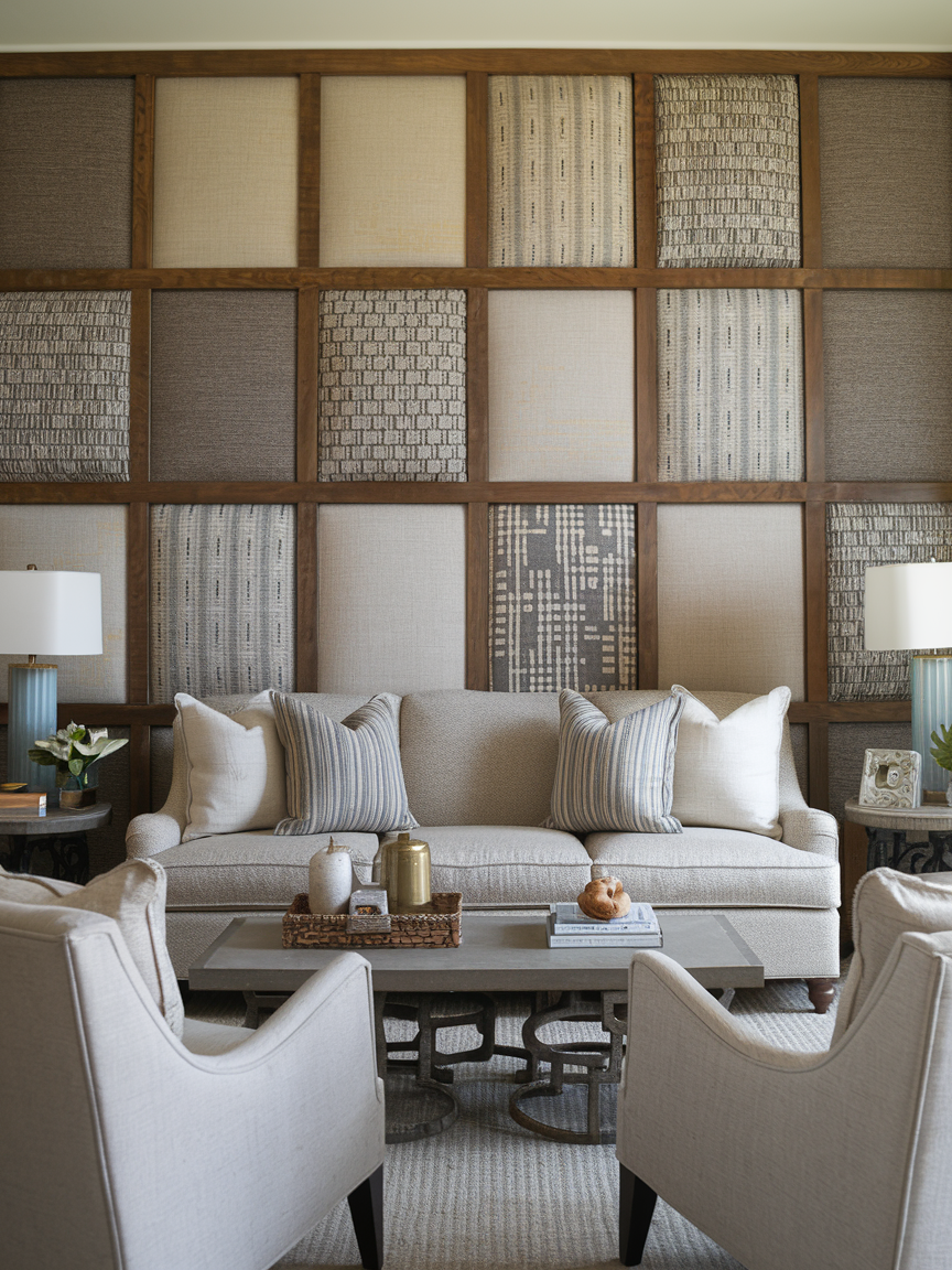 Fabric panels bring softness, color, and texture to your living room while creating a unique and cozy accent wall. Stretch patterned or solid fabric over lightweight frames or foam boards and arrange them in a grid or asymmetrical layout for a custom design. This approach works beautifully with linen, velvet, or woven textiles that add depth without overwhelming the space. Choose patterns that complement your color palette, such as subtle geometrics, botanical prints, or warm, earthy tones. Fabric panels also help absorb sound, making the living room feel quieter and more comfortable. Pair the wall with simple furniture and layered textiles like throws and cushions to create a cohesive look. This idea is perfect for adding a playful, artistic touch that feels warm, inviting, and easy to change whenever you want a fresh update.
