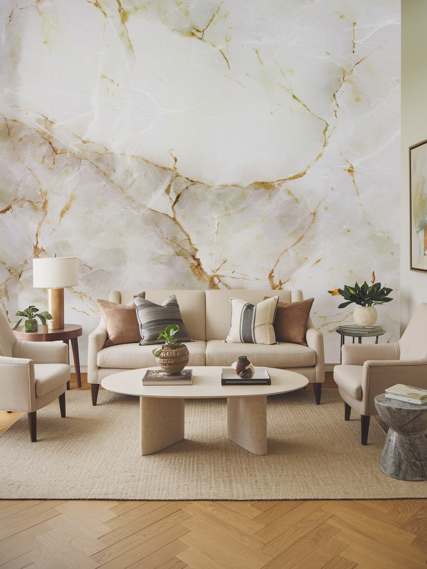 A marble-effect accent wall offers the elegance of natural stone without the cost or installation complexity. High-quality marble contact paper can transform a plain wall into a luxurious focal point with beautiful veining and subtle texture. Choose classic white marble for a bright and airy look or darker tones for a dramatic, modern feel. This design works especially well behind a media console or sofa, where it adds visual interest without needing additional decor. Keep surrounding furniture simple and neutral to let the pattern stand out. The reflective quality of marble designs also helps bounce light around the room, enhancing brightness. This option is ideal for homeowners who want a playful yet sophisticated upgrade that combines style, affordability, and easy application.