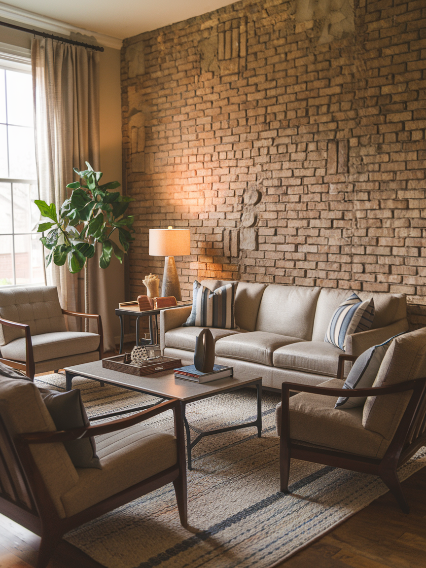 A brick veneer accent wall adds character, texture, and a touch of urban charm to your living room. Whether you choose classic red brick, whitewashed finishes, or soft gray tones, the textured surface creates depth and warmth that instantly transforms the space. Brick works beautifully in industrial, modern farmhouse, or contemporary interiors, depending on how it’s styled. Pair it with wood furniture, metal accents, and soft textiles to balance the rugged texture. This type of accent wall looks especially striking behind a fireplace or television area. Lighting also plays an important role, as wall sconces or warm ambient lighting can highlight the natural texture. A brick veneer wall is a playful yet timeless design choice that adds personality while maintaining a cozy and inviting atmosphere.