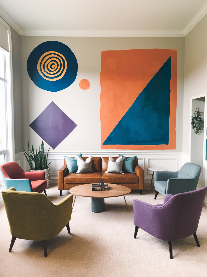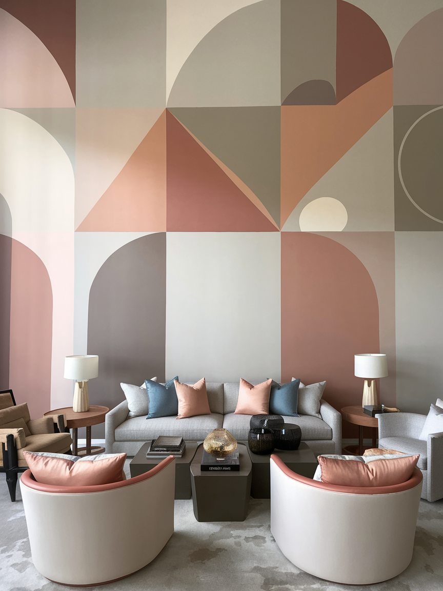 Large geometric shapes create a bold and contemporary accent wall that brings movement and personality into your living room. Triangles, arches, circles, or abstract forms painted in soft neutrals or vibrant tones can dramatically change the energy of the space. The oversized scale keeps the design from feeling busy while still making a strong visual impact. This style works beautifully behind a sofa or entertainment unit, where the shapes naturally frame the furniture. Choose a cohesive color palette that complements your existing decor to maintain harmony throughout the room. Matte paint finishes help the design feel sophisticated rather than overly playful. Add simple decor elements like solid-color cushions or a textured rug to tie everything together. This accent wall idea is ideal for creating a stylish, modern atmosphere that feels creative yet thoughtfully designed.