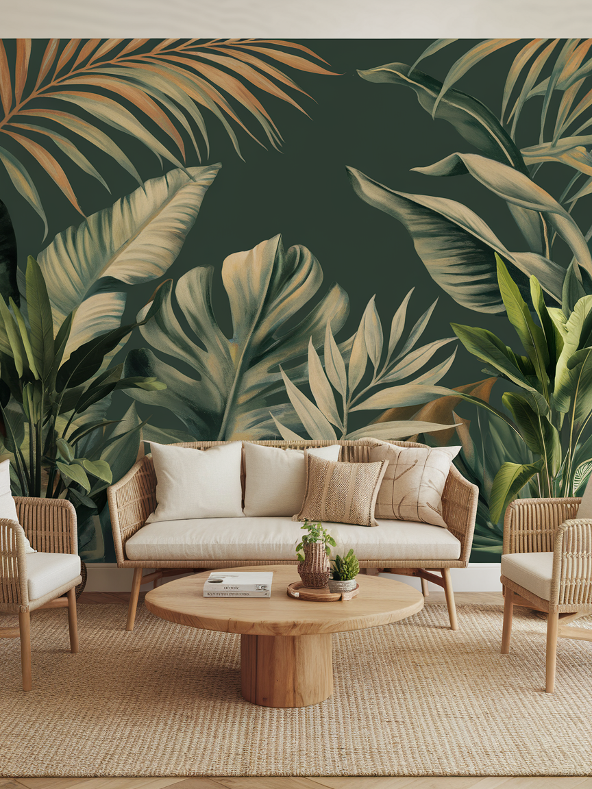 A tropical mural accent wall brings energy, color, and a sense of escape into your living room. Large-scale palm leaves, lush greenery, or abstract botanical patterns create a bold focal point that instantly livens up the space. Choose a color palette that complements your decor, such as deep greens with warm neutrals or soft tropical tones for a more subtle effect. This design works best when paired with natural materials like wood, rattan, and woven textures to enhance the relaxed atmosphere. Keep furniture simple so the mural remains the star of the room. Adding indoor plants nearby will further connect the design to nature. A tropical mural is perfect for homeowners who want a playful, refreshing accent wall that feels vibrant, stylish, and full of personality.