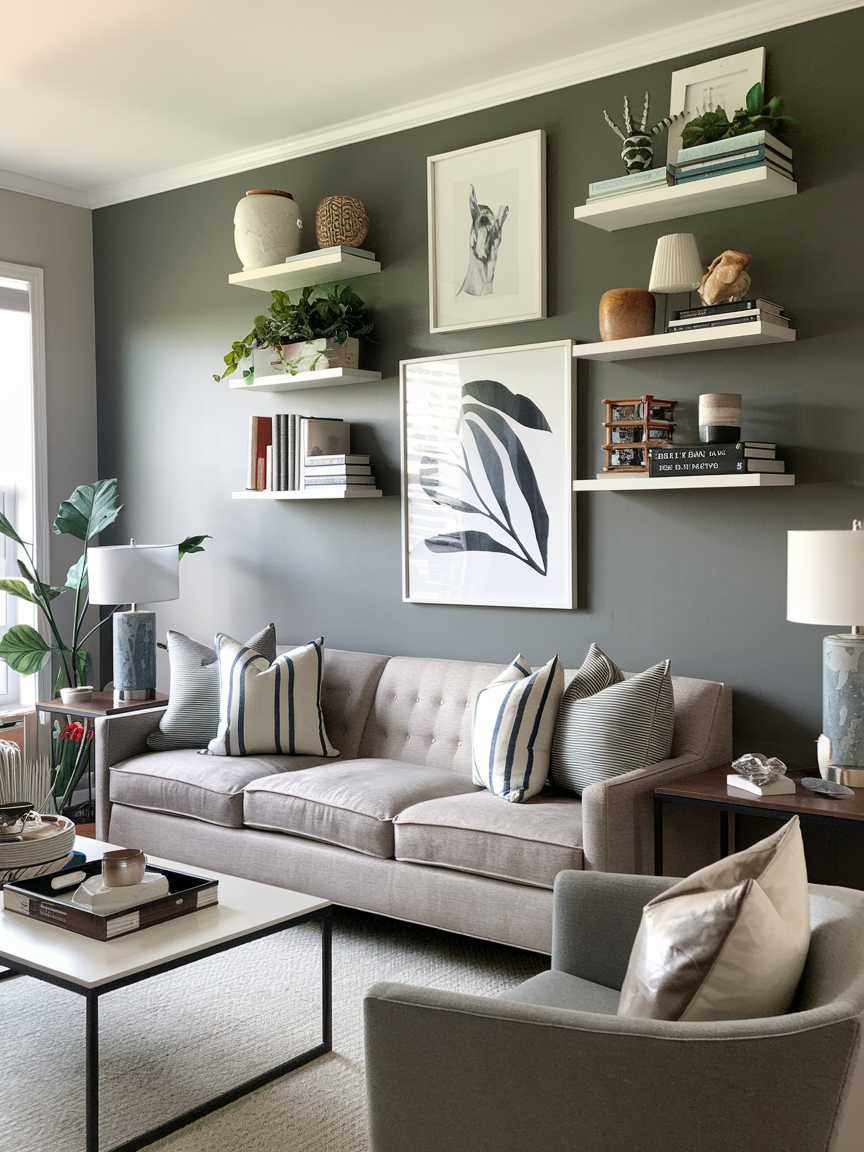 Floating shelves can turn a simple wall into a functional and decorative focal point. Arrange shelves in a balanced layout and style them with books, artwork, plants, and personal objects to create a layered display. Painting the wall behind the shelves in a contrasting or complementary color helps highlight the arrangement and adds depth. This design allows you to refresh the look seasonally by swapping decor items without changing the structure. Keep the styling cohesive by maintaining a consistent color palette and mixing different heights and textures. This idea works especially well in living rooms where personalization is important. A floating shelf accent wall combines practicality with playful styling, making the space feel curated, dynamic, and uniquely yours.